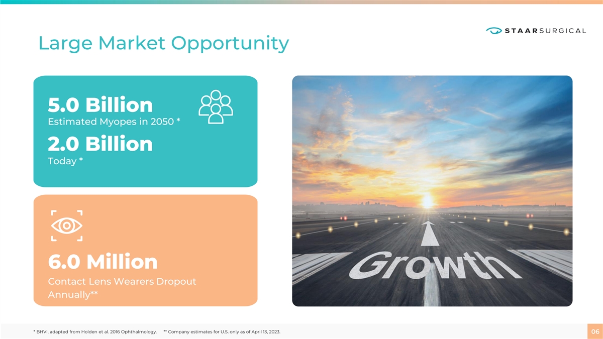 What is EVO ICL? • Proprietary lens designed to correct or reduce refractive error (blurred vision), i.e., myopia • EVO ICL is well-positioned as dominant lens-based refractive solution Negligible Lens- 1 A Quick Procedure Advantages Based Competition Eye drops to dilate pupil No Capital Investment Over 20 Phakic IOLs and anesthetize eye (PIOLs) have been 2 Removable by a Doctor marketed Surgeon makes small incision to implant EVO Preserves the Cornea All other PIOLs lens withdrawn from market Collamer Material or have gained de EVO lens is folded, (Bio-compatible, Quiet minimimus commercial inserted and placed into in the Eye) success, e.g., diligence position Acrysof Cachet®, Quantity & Quality of Verisyse and Eyebright Post-Procedure: Follow- Vision Medical Phakic IOLs up visits with the surgeon Post-Procedure: Routine EVO ICL Market Share Natural annual eye exams 3 Iris EVO ICL™ > 90% Crystalline Lens 1) Packer, The Implantable Collamer Lens with a central port: review of the literature, Clinical Ophthalmology, 2018. 2) STAAR estimates and Elies D. 20 y Collamer in my patient’s eyes. Presentation at 2018 STAAR Experts Meeting, Vienna. 3) Market 04 Scope and STAAR Market Share Refractive Procedures ICL Trends, May 2023.