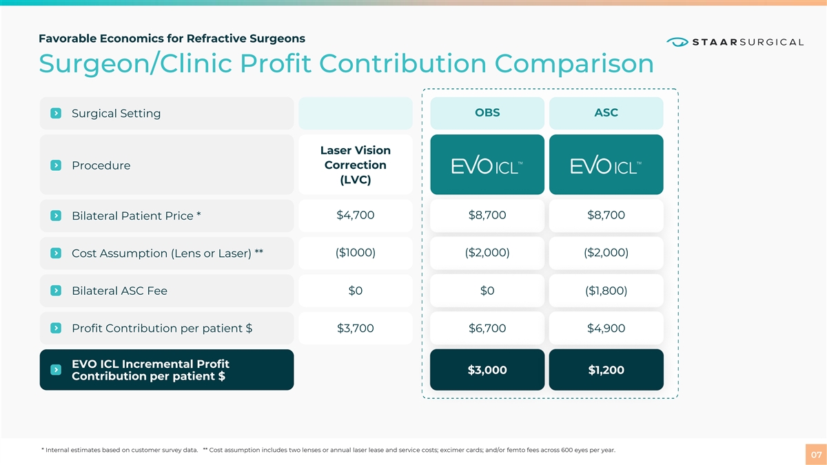 Favorable Economics for Refractive Surgeons Surgeon/Clinic Profit Contribution Comparison OBS ASC Surgical Setting Laser Vision Correction Procedure (LVC) $4,700 $8,700 $8,700 Bilateral Patient Price * ($1000) ($2,000) ($2,000) Cost Assumption (Lens or Laser) ** Bilateral ASC Fee $0 $0 ($1,800) Profit Contribution per patient $ $3,700 $6,700 $4,900 EVO ICL Incremental Profit $3,000 $1,200 Contribution per patient $ * Internal estimates based on customer survey data. ** Cost assumption includes two lenses or annual laser lease and service costs; excimer cards; and/or femto fees across 600 eyes per year. 07