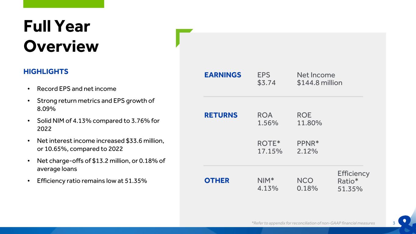 3 Full Year Overview RETURNS EARNINGS *Refer to appendix for reconciliation of non-GAAP financial measures EPS $3.74 Net Income $144.8 million ROA 1.56% ROE 11.80% ROTE* 17.15% PPNR* 2.12% HIGHLIGHTS • Record EPS and net income • Strong return metrics and EPS growth of 8.09% • Solid NIM of 4.13% compared to 3.76% for 2022 • Net interest income increased $33.6 million, or 10.65%, compared to 2022 • Net charge-offs of $13.2 million, or 0.18% of average loans • Efficiency ratio remains low at 51.35% NIM* 4.13% NCO 0.18% OTHER Efficiency Ratio* 51.35%