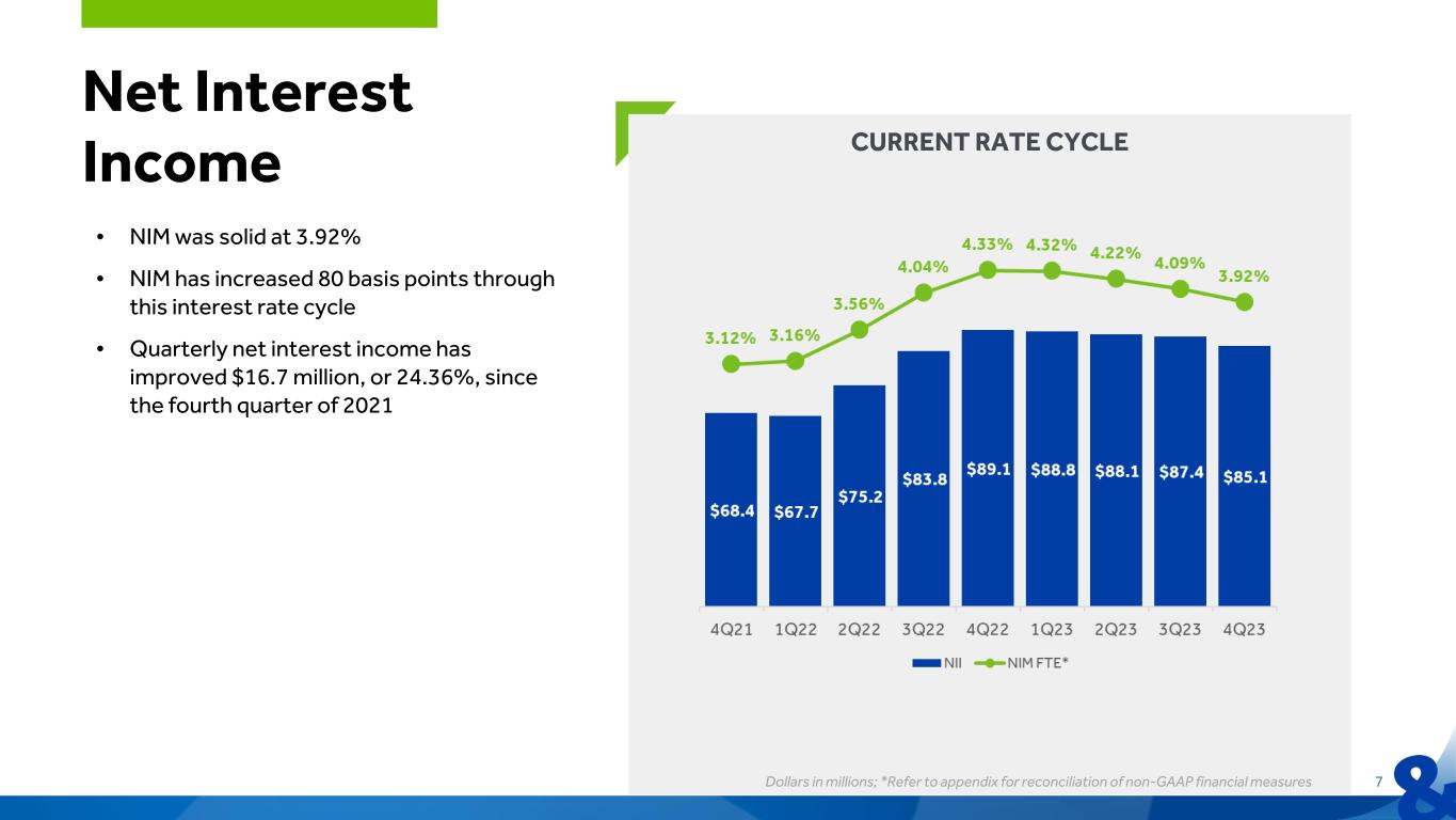 Asset Quality ACL Trend: Dollars in millions 6 ASSET QUALITY TRENDS • ACL relatively stable at 1.41% • Net charge-offs of $3.6 million, or 0.19% of average loans (annualized) • NPAs remain low at 0.30% of total loans plus OREO