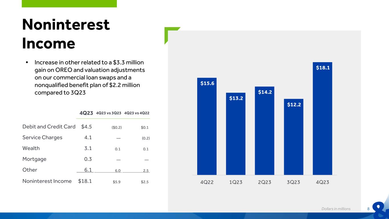 • NIM was solid at 3.92% • NIM has increased 80 basis points through this interest rate cycle • Quarterly net interest income has improved $16.7 million, or 24.36%, since the fourth quarter of 2021 Net Interest Income Dollars in millions; *Refer to appendix for reconciliation of non-GAAP financial measures 7 CURRENT RATE CYCLE