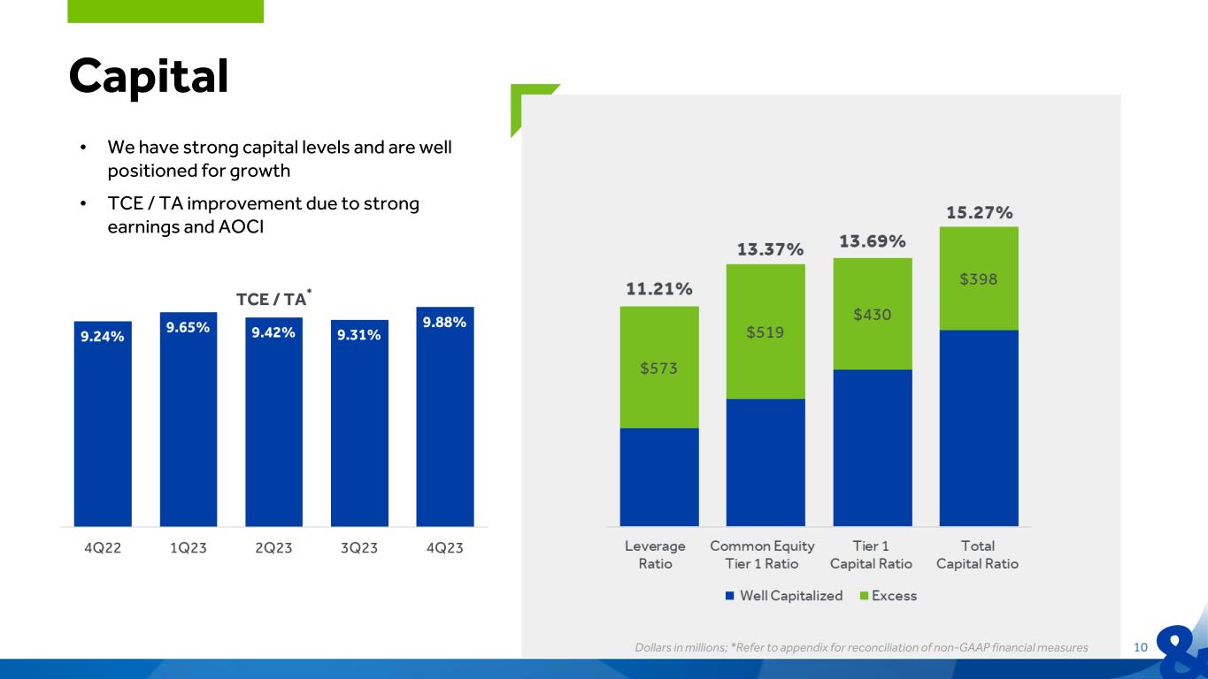 4Q23 4Q23 vs 3Q23 4Q23 vs 4Q22 Salaries & Benefits $31.0 $3.5 $3.0 Data Processing 4.5 — 0.3 FF&E 3.7 0.6 0.7 Occupancy 3.6 (0.1) (0.2) Professional Services 2.0 — (0.1) Other Taxes 1.9 — 0.1 Marketing 1.4 (0.3) — FDIC 1.0 — 0.6 Other 7.1 (0.3) 0.5 Noninterest Expense $56.2 $3.4 $4.9 Noninterest Expense 9Dollars in millions; *Refer to appendix for reconciliation of non-GAAP financial measures • Higher expenses mainly due to an increase in salaries and benefits due to higher medical, incentives and valuation adjustments on a nonqualified benefit plan