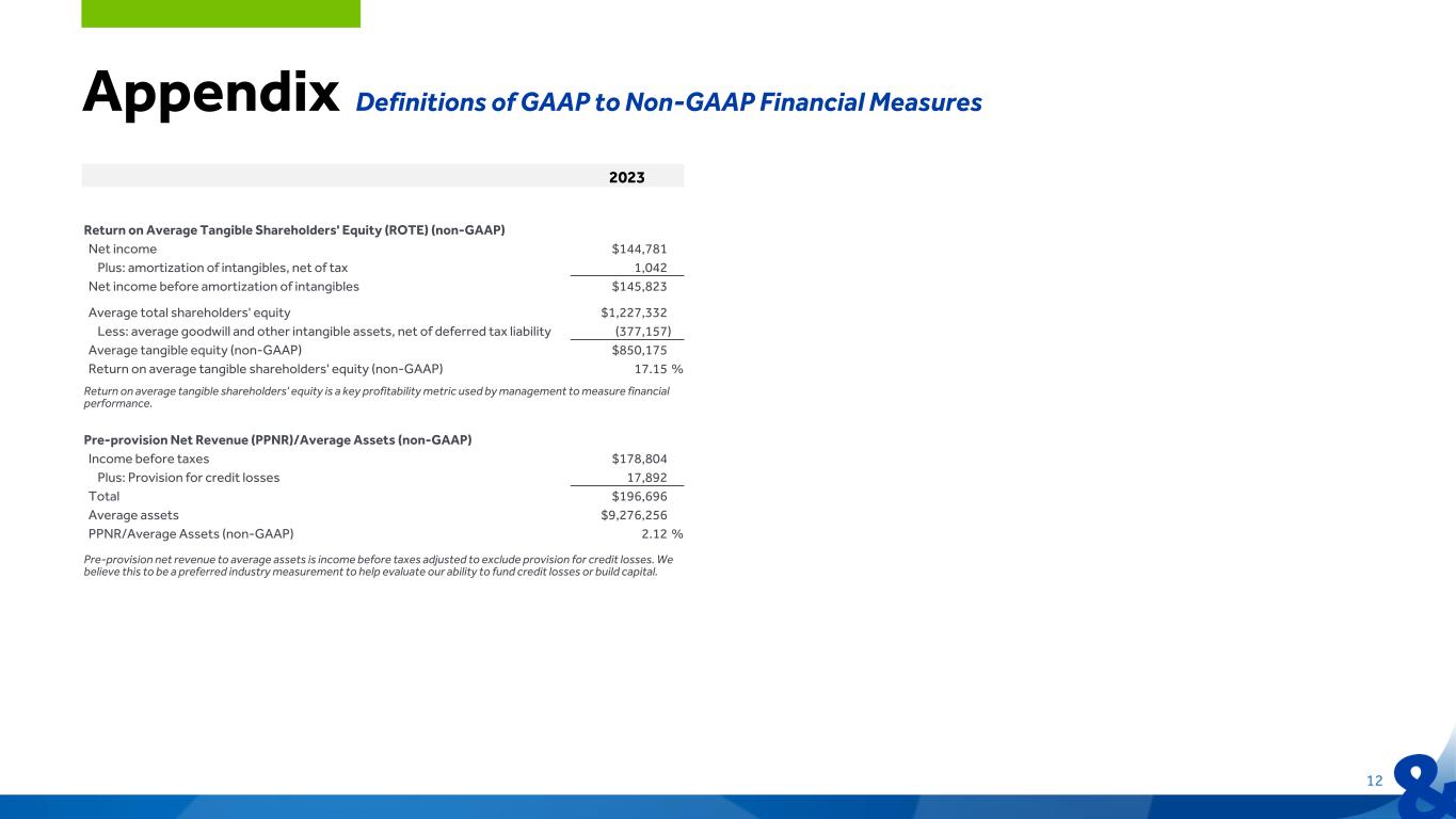 4Q23 Return on Average Tangible Shareholders' Equity (ROTE) (non-GAAP) Net income (annualized) $146,980 Plus: amortization of intangibles (annualized), net of tax 1,003 Net income before amortization of intangibles (annualized) $147,983 Average total shareholders' equity $1,247,030 Less: average goodwill and other intangible assets, net of deferred tax liability (376,761) Average tangible equity (non-GAAP) $870,269 Return on average tangible shareholders' equity (non-GAAP) 17.00 % Return on average tangible shareholders' equity is a key profitability metric used by management to measure financial performance. Pre-provision Net Revenue (PPNR)/Average Assets (non-GAAP) Income before taxes $46,024 Plus: Provision for credit losses 943 Total $46,967 Total (annualized) (non-GAAP) $186,336 Average assets $9,473,669 PPNR/Average Assets (non-GAAP) 1.97 % Pre-provision net revenue to average assets is income before taxes adjusted to exclude provision for credit losses. We believe this to be a preferred industry measurement to help evaluate our ability to fund credit losses or build capital. Appendix Definitions of GAAP to Non-GAAP Financial Measures 11