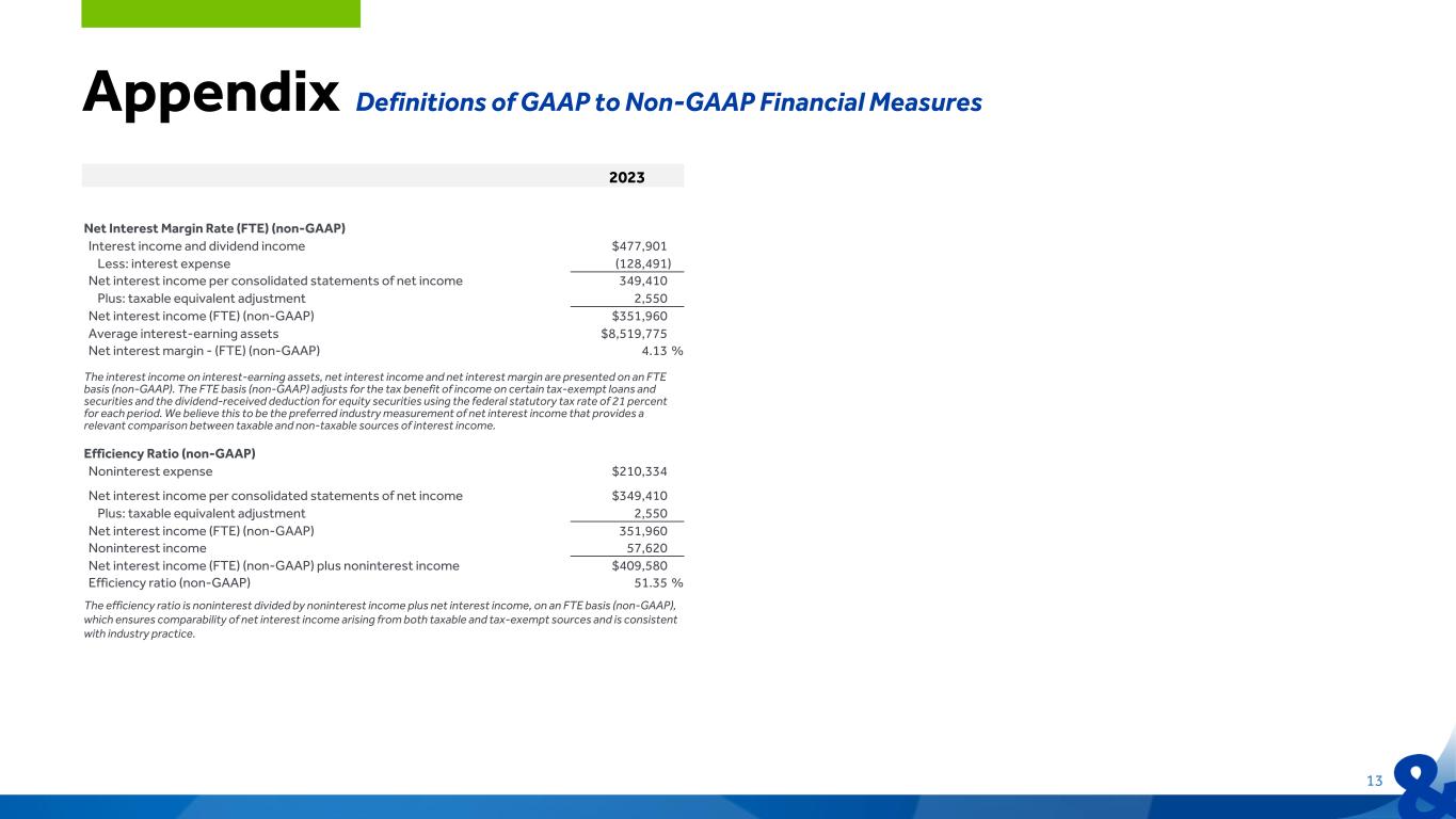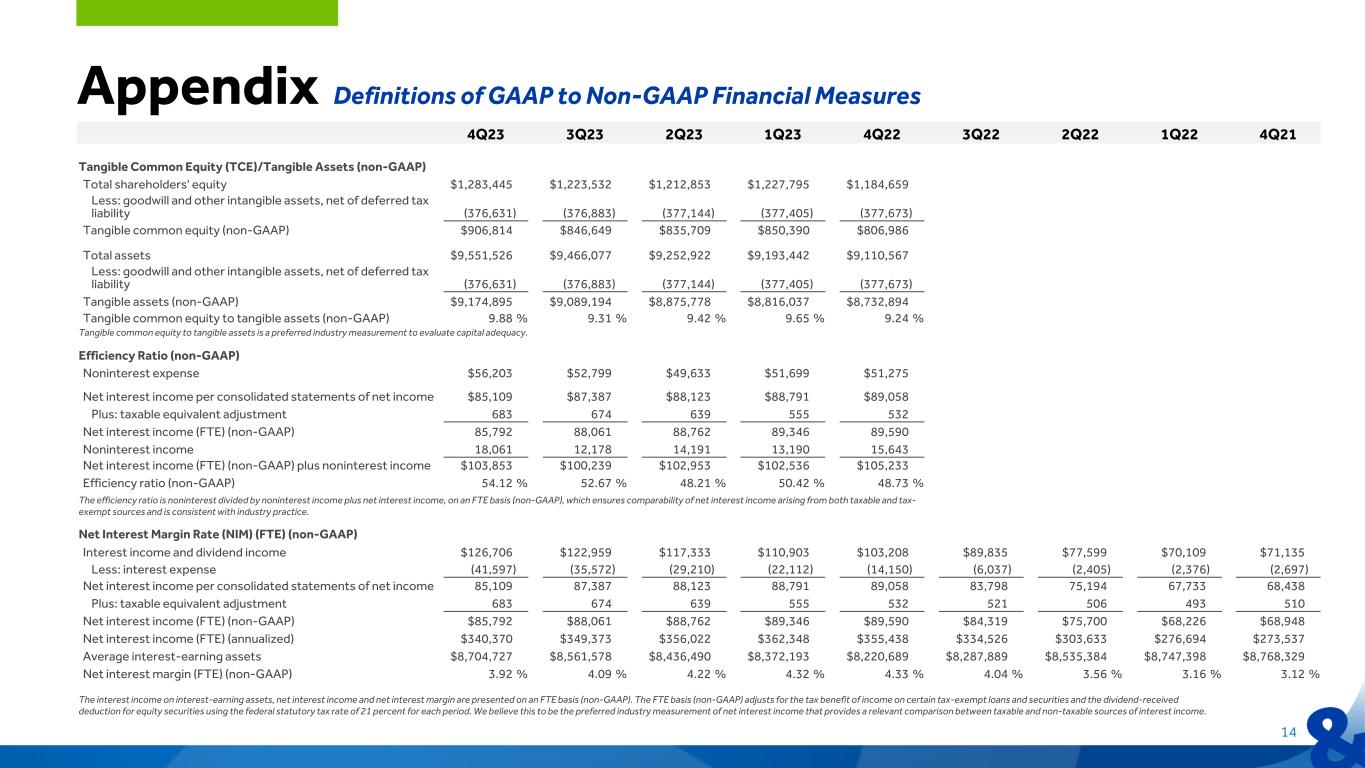 2023 Net Interest Margin Rate (FTE) (non-GAAP) Interest income and dividend income $477,901 Less: interest expense (128,491) Net interest income per consolidated statements of net income 349,410 Plus: taxable equivalent adjustment 2,550 Net interest income (FTE) (non-GAAP) $351,960 Average interest-earning assets $8,519,775 Net interest margin - (FTE) (non-GAAP) 4.13 % The interest income on interest-earning assets, net interest income and net interest margin are presented on an FTE basis (non-GAAP). The FTE basis (non-GAAP) adjusts for the tax benefit of income on certain tax-exempt loans and securities and the dividend-received deduction for equity securities using the federal statutory tax rate of 21 percent for each period. We believe this to be the preferred industry measurement of net interest income that provides a relevant comparison between taxable and non-taxable sources of interest income. Efficiency Ratio (non-GAAP) Noninterest expense $210,334 Net interest income per consolidated statements of net income $349,410 Plus: taxable equivalent adjustment 2,550 Net interest income (FTE) (non-GAAP) 351,960 Noninterest income 57,620 Net interest income (FTE) (non-GAAP) plus noninterest income $409,580 Efficiency ratio (non-GAAP) 51.35 % The efficiency ratio is noninterest divided by noninterest income plus net interest income, on an FTE basis (non-GAAP), which ensures comparability of net interest income arising from both taxable and tax-exempt sources and is consistent with industry practice. Appendix Definitions of GAAP to Non-GAAP Financial Measures 13