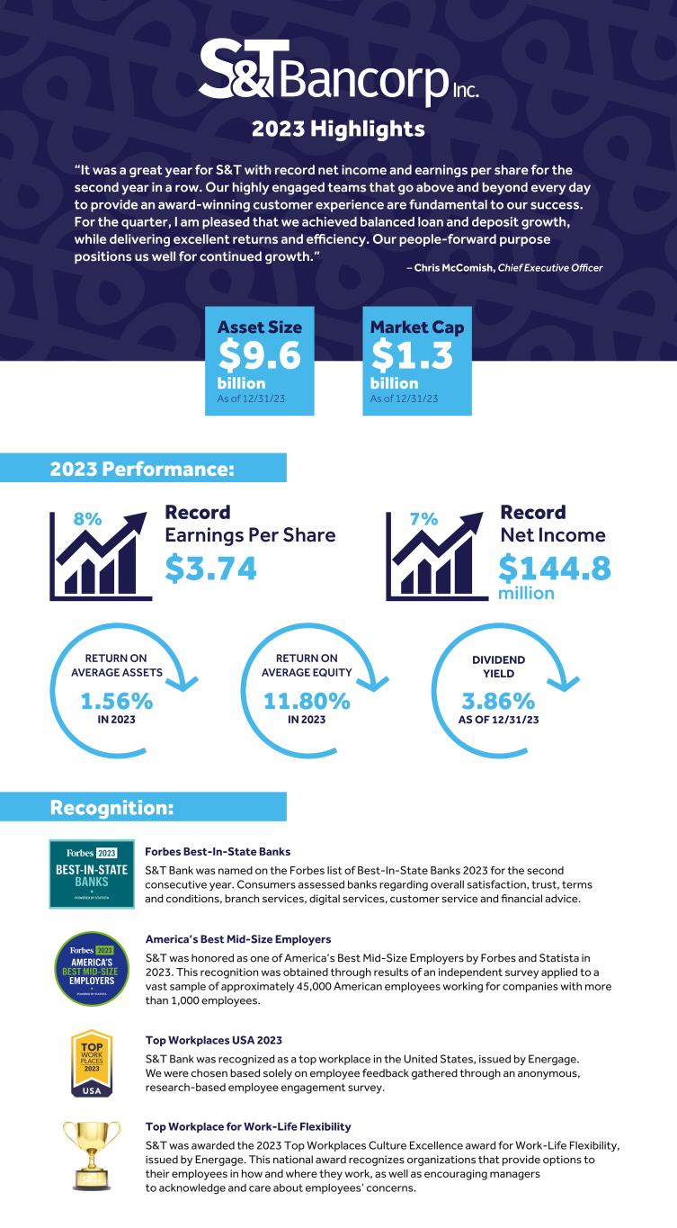 Asset Size $9.6 billion As of 12/31/23 Market Cap $1.3 billion As of 12/31/23 2023 Performance: 2023 Highlights “It was a great year for S&T with record net income and earnings per share for the second year in a row. Our highly engaged teams that go above and beyond every day to provide an award-winning customer experience are fundamental to our success. For the quarter, I am pleased that we achieved balanced loan and deposit growth, while delivering excellent returns and efficiency. Our people-forward purpose positions us well for continued growth.” – Chris McComish, Chief Executive Officer million Record Earnings Per Share $3.74 8% Record Net Income $144.8 7% 11.80% IN 2023 1.56% IN 2023 3.86% AS OF 12/31/23 DIVIDEND YIELD Recognition: Top Workplaces USA 2023 S&T Bank was recognized as a top workplace in the United States, issued by Energage. We were chosen based solely on employee feedback gathered through an anonymous, research-based employee engagement survey. Top Workplace for Work-Life Flexibility S&T was awarded the 2023 Top Workplaces Culture Excellence award for Work-Life Flexibility, issued by Energage. This national award recognizes organizations that provide options to their employees in how and where they work, as well as encouraging managers to acknowledge and care about employees’ concerns. America’s Best Mid-Size Employers S&T was honored as one of America’s Best Mid-Size Employers by Forbes and Statista in 2023. This recognition was obtained through results of an independent survey applied to a vast sample of approximately 45,000 American employees working for companies with more than 1,000 employees. Forbes Best-In-State Banks S&T Bank was named on the Forbes list of Best-In-State Banks 2023 for the second consecutive year. Consumers assessed banks regarding overall satisfaction, trust, terms and conditions, branch services, digital services, customer service and financial advice.