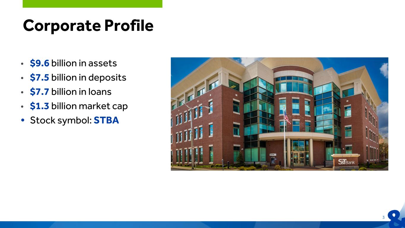 3 • $9.6 billion in assets • $7.5 billion in deposits • $7.7 billion in loans • $1.3 billion market cap • Stock symbol: STBA Corporate Profile