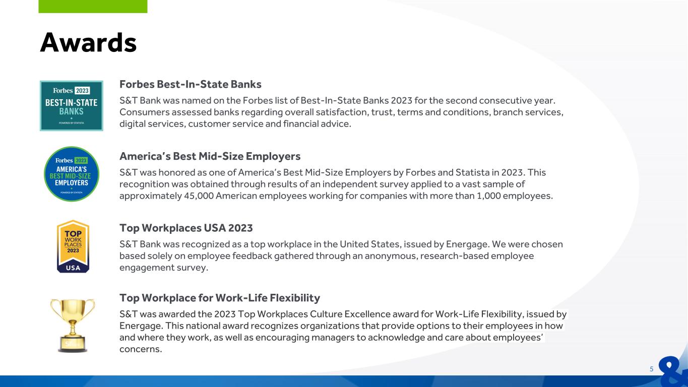 Awards 5 Top Workplaces USA 2023 S&T Bank was recognized as a top workplace in the United States, issued by Energage. We were chosen based solely on employee feedback gathered through an anonymous, research-based employee engagement survey. Forbes Best-In-State Banks S&T Bank was named on the Forbes list of Best-In-State Banks 2023 for the second consecutive year. Consumers assessed banks regarding overall satisfaction, trust, terms and conditions, branch services, digital services, customer service and financial advice. Top Workplace for Work-Life Flexibility S&T was awarded the 2023 Top Workplaces Culture Excellence award for Work-Life Flexibility, issued by Energage. This national award recognizes organizations that provide options to their employees in how and where they work, as well as encouraging managers to acknowledge and care about employees’ concerns. America’s Best Mid-Size Employers S&T was honored as one of America’s Best Mid-Size Employers by Forbes and Statista in 2023. This recognition was obtained through results of an independent survey applied to a vast sample of approximately 45,000 American employees working for companies with more than 1,000 employees.