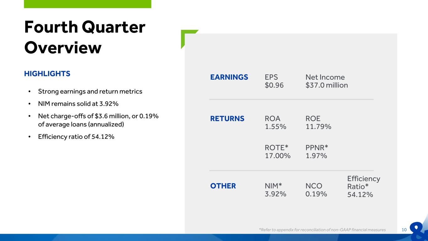 9 Full Year Overview RETURNS EARNINGS *Refer to appendix for reconciliation of non-GAAP financial measures EPS $3.74 Net Income $144.8 million ROA 1.56% ROE 11.80% ROTE* 17.15% PPNR* 2.12% HIGHLIGHTS • Record EPS and net income • Strong return metrics and EPS growth of 8.09% • Solid NIM of 4.13% compared to 3.76% for 2022 • Net interest income increased $33.6 million, or 10.65%, compared to 2022 • Net charge-offs of $13.2 million, or 0.18% of average loans • Efficiency ratio remains low at 51.35% NIM* 4.13% NCO 0.18% OTHER Efficiency Ratio* 51.35%