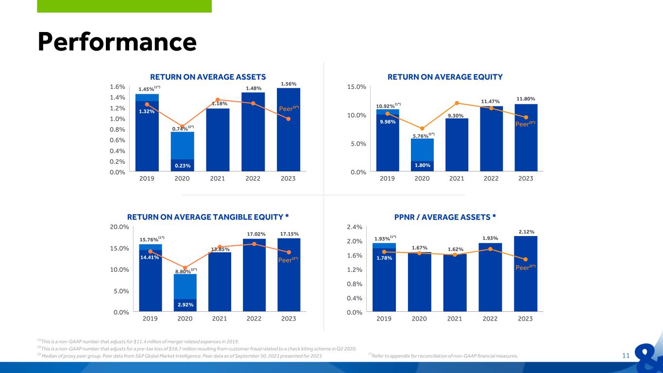 PPNR / AVERAGE ASSETS * 2019 2020 2021 2022 2023 0.0% 0.4% 0.8% 1.2% 1.6% 2.0% 2.4% RETURN ON AVERAGE TANGIBLE EQUITY * 2019 2020 2021 2022 2023 0.0% 5.0% 10.0% 15.0% 20.0% RETURN ON AVERAGE EQUITY 2019 2020 2021 2022 2023 0.0% 5.0% 10.0% 15.0% RETURN ON AVERAGE ASSETS 2019 2020 2021 2022 2023 0.0% 0.2% 0.4% 0.6% 0.8% 1.0% 1.2% 1.4% 1.6% Performance 11 1.32% 1.45%(1*) 0.74%(2*) 0.23% 1.56% 10.92%(1*) 5.76%(2*) 1.80% 11.80% 9.98% 1.93%(1*) 1.62% 2.12% 1.78% 15.76%(1*) 2.92% 8.80%(2*) 14.41% (1)This is a non-GAAP number that adjusts for $11.4 million of merger related expenses in 2019. (2)This is a non-GAAP number that adjusts for a pre-tax loss of $58.7 million resulting from customer fraud related to a check kiting scheme in Q2 2020. (3) Median of proxy peer group. Peer data from S&P Global Market Intelligence. Peer data as of September 30, 2023 presented for 2023. (*)Refer to appendix for reconciliation of non-GAAP financial measures. 1.18% 9.30% 13.85% 1.67% 1.93% 1.32% 1.48% 9.98% 11.47% 14.41% 17.02% 17.15% Peer(3*) Peer(3*) Peer(3*) Peer(3*)