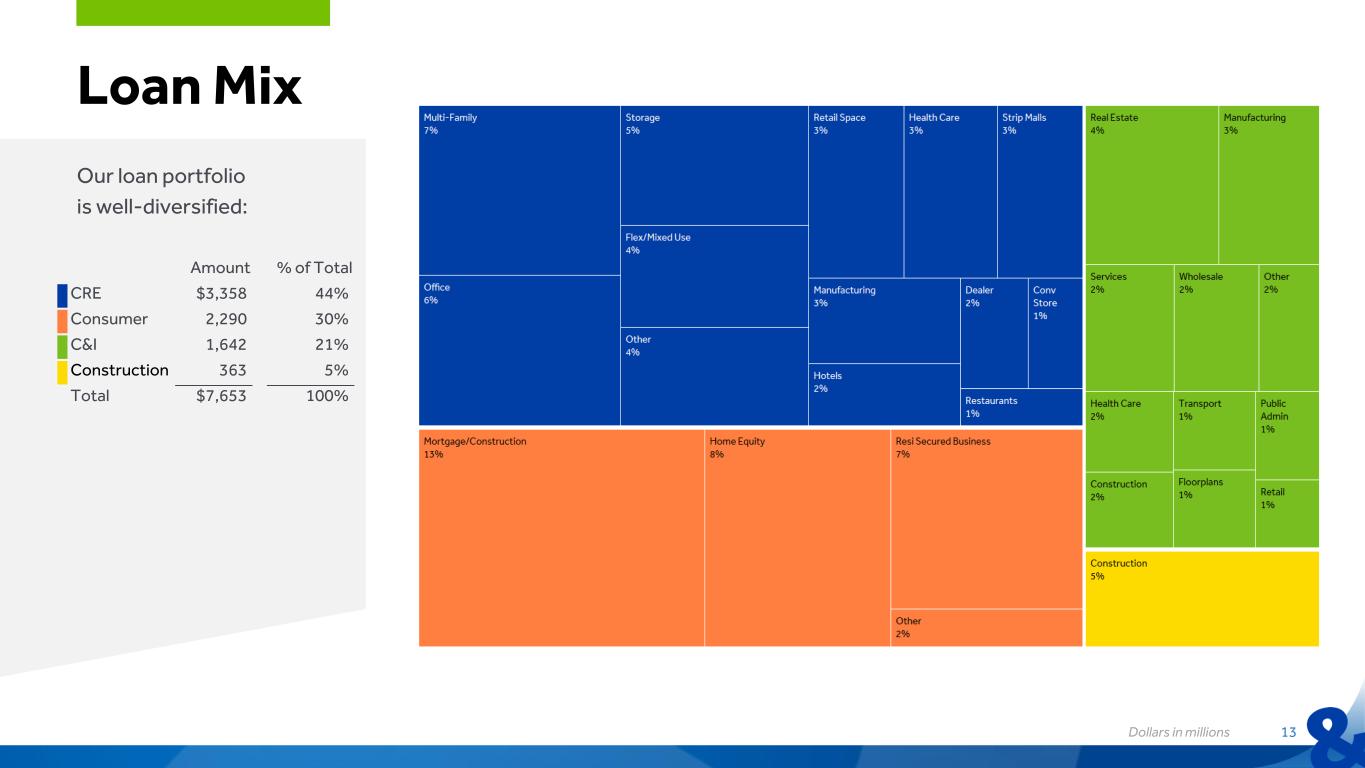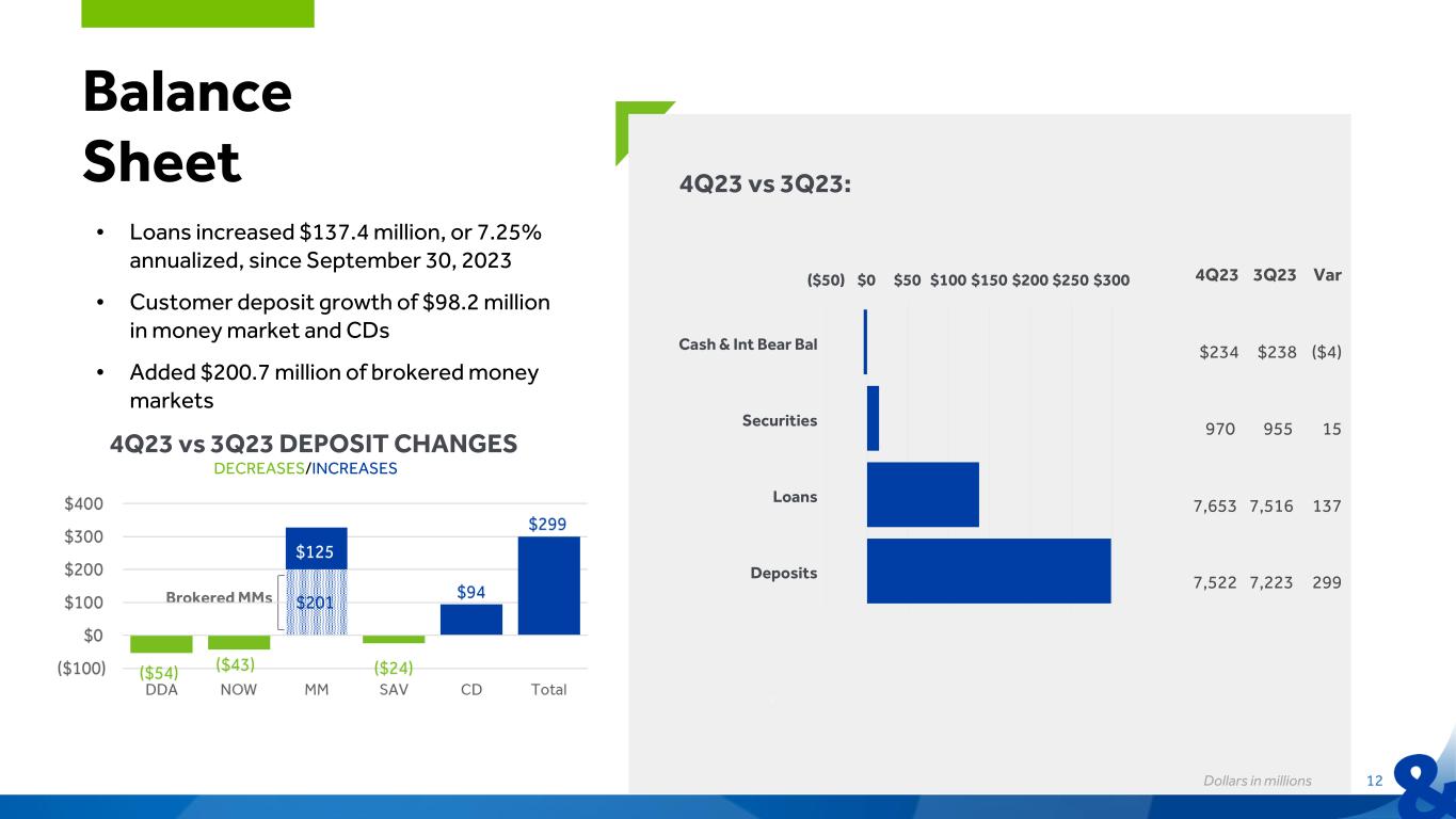 Balance Sheet • Loans increased $137.4 million, or 7.25% annualized, since September 30, 2023 • Customer deposit growth of $98.2 million in money market and CDs • Added $200.7 million of brokered money markets Dollars in millions 12 4Q23 3Q23 Var $234 $238 ($4) 970 955 15 7,653 7,516 137 7,522 7,223 299 Cash & Int Bear Bal Securities Loans Deposits ($50) $0 $50 $100 $150 $200 $250 $300 4Q23 vs 3Q23: 4Q23 vs 3Q23 DEPOSIT CHANGES DECREASES/INCREASES Brokered MMs