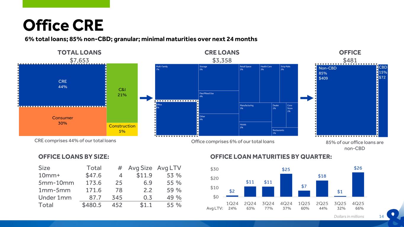 Loan Mix Our loan portfolio is well-diversified: Dollars in millions 13 Amount % of Total CRE $3,358 44% Consumer 2,290 30% C&I 1,642 21% Construction 363 5% Total $7,653 100%