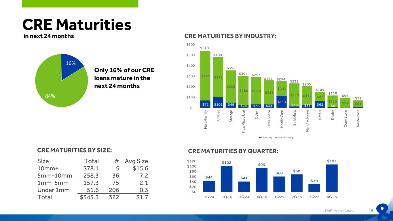 Office CRE Dollars in millions 14 CRE comprises 44% of our total loans Office comprises 6% of our total loans TOTAL LOANS $7,653 CRE LOANS $3,358 OFFICE $481 85% of our office loans are non-CBD CBD 15% $72 OFFICE LOANS BY SIZE: Size Total # Loans Avg Size Avg LTV 10mm+ $47.6 4 $11.9 53 % 5mm-10mm 173.6 25 6.9 55 % 1mm-5mm 171.6 78 2.2 59 % Under 1mm 87.7 345 0.3 49 % Total $480.5 452 $1.1 55 % OFFICE LOAN MATURITIES BY QUARTER: Avg LTV: 24% 63% 77% 37% 60% 44% 32% 66% 6% total loans; 85% non-CBD; granular; minimal maturities over next 24 months Non-CBD 85% $409