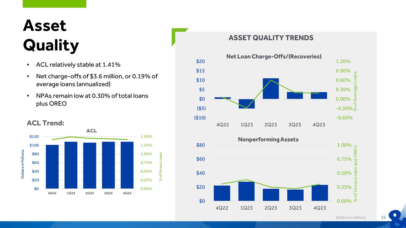 Financial Data 28 Asset Quality 2023 2022 2021 2020 2019 Dollars in thousands Total Nonaccrual Loans $22,946 $19,052 $66,291 $146,774 $54,057 Nonaccrual Loans/Total Loans 0.30% 0.27% 0.95% 2.03% 0.76% Nonperforming Assets/Total Loans + OREO 0.30% 0.31% 1.13% 2.06% 0.81% Net Charge-offs/Average Loans 0.18% 0.04% 0.49% 1.40% 0.22% Allowance for Credit Losses/Total Portfolio Loans 1.41% 1.41% 1.41% 1.63% 0.87% Allowance for Credit Losses/Nonaccrual Loans 471% 532% 149% 80% 115%