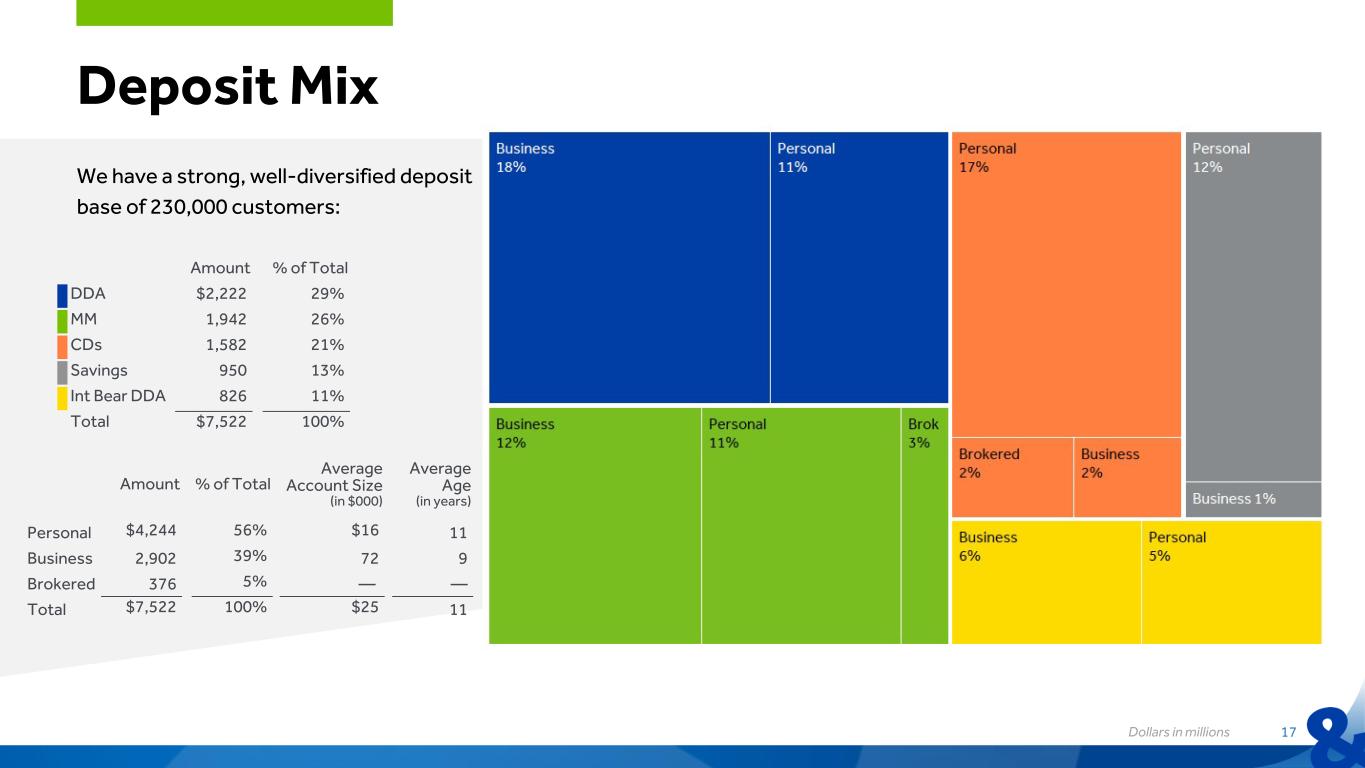 Deposit Mix We have a strong, well-diversified deposit base of 230,000 customers: Dollars in millions 17 Amount % of Total DDA $2,222 29% MM 1,942 26% CDs 1,582 21% Savings 950 13% Int Bear DDA 826 11% Total $7,522 100% Amount % of Total Average Account Size (in $000) Average Age (in years) Personal $4,244 56% $16 11 Business 2,902 39% 72 9 Brokered 376 5% — — Total $7,522 100% $25 11