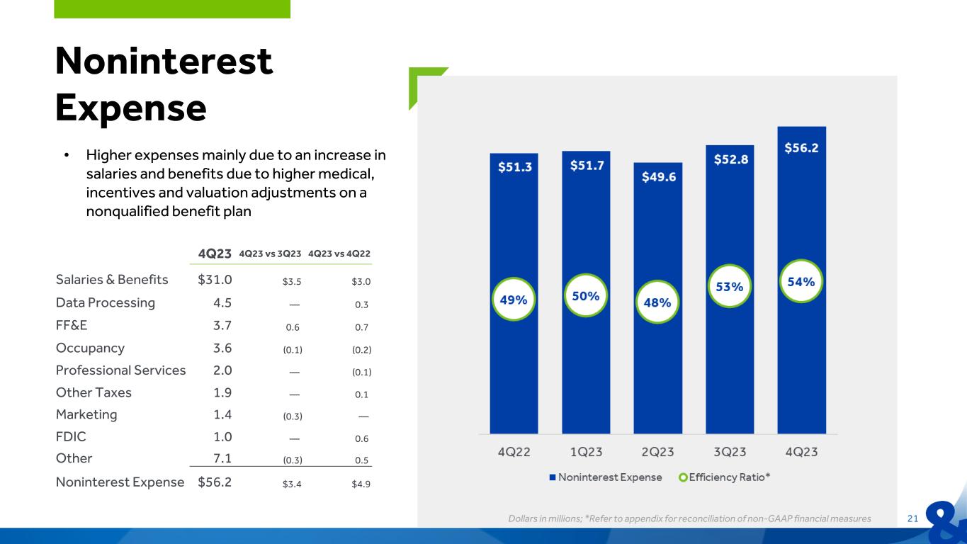 4Q23 4Q23 vs 3Q23 4Q23 vs 4Q22 Debit and Credit Card $4.5 ($0.2) $0.1 Service Charges 4.1 — (0.2) Wealth 3.1 0.1 0.1 Mortgage 0.3 — — Other 6.1 6.0 2.5 Noninterest Income $18.1 $5.9 $2.5 Noninterest Income 20Dollars in millions • Increase in other related to a $3.3 million gain on OREO and valuation adjustments on our commercial loan swaps and a nonqualified benefit plan of $2.2 million compared to 3Q23