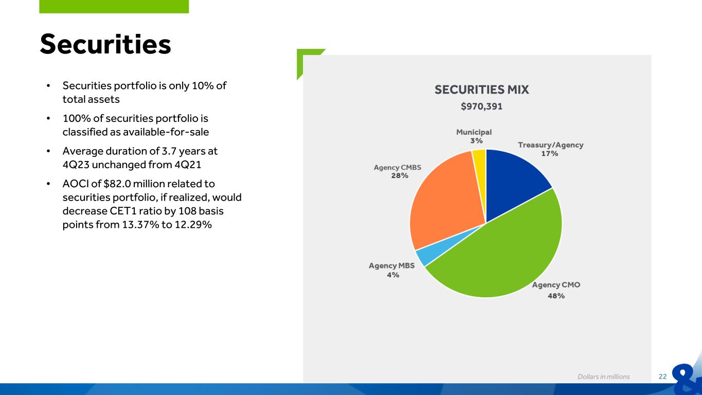 Securities 22 • Securities portfolio is only 10% of total assets • 100% of securities portfolio is classified as available-for-sale • Average duration of 3.7 years at 4Q23 unchanged from 4Q21 • AOCI of $82.0 million related to securities portfolio, if realized, would decrease CET1 ratio by 108 basis points from 13.37% to 12.29% SECURITIES MIX $970,391 Dollars in millions