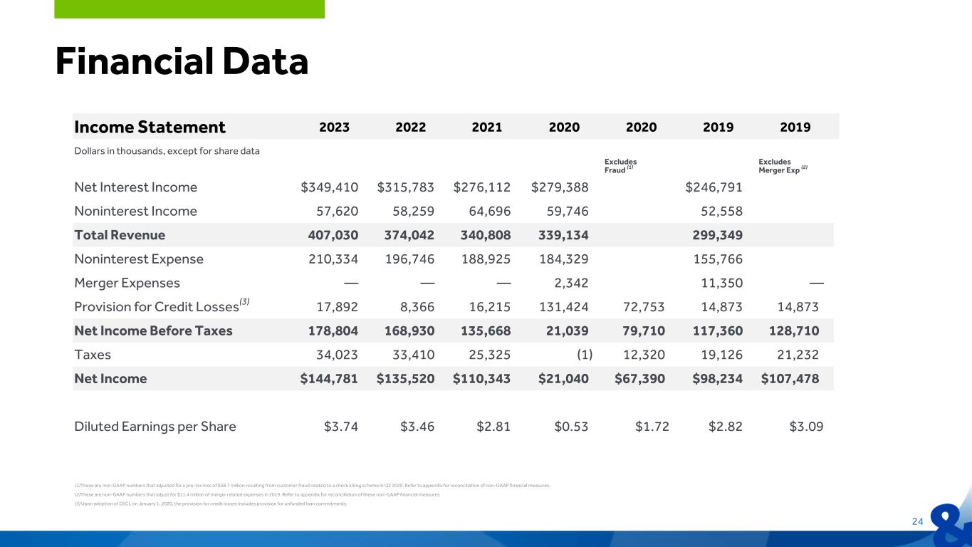 Financial Data (1)These are non-GAAP numbers that adjusted for a pre-tax loss of $58.7 million resulting from customer fraud related to a check kiting scheme in Q2 2020. Refer to appendix for reconciliation of non-GAAP financial measures. (2)These are non-GAAP numbers that adjust for $11.4 million of merger related expenses in 2019. Refer to appendix for reconciliation of these non-GAAP financial measures (3) Upon adoption of CECL on January 1, 2020, the provision for credit losses includes provision for unfunded loan commitments. Income Statement 2023 2022 2021 2020 2020 2019 2019 Dollars in thousands, except for share data Excludes Fraud (1) Excludes Merger Exp (2) Net Interest Income $349,410 $315,783 $276,112 $279,388 $246,791 Noninterest Income 57,620 58,259 64,696 59,746 52,558 Total Revenue 407,030 374,042 340,808 339,134 299,349 Noninterest Expense 210,334 196,746 188,925 184,329 155,766 Merger Expenses — — — 2,342 11,350 — Provision for Credit Losses(3) 17,892 8,366 16,215 131,424 72,753 14,873 14,873 Net Income Before Taxes 178,804 168,930 135,668 21,039 79,710 117,360 128,710 Taxes 34,023 33,410 25,325 (1) 12,320 19,126 21,232 Net Income $144,781 $135,520 $110,343 $21,040 $67,390 $98,234 $107,478 Diluted Earnings per Share $3.74 $3.46 $2.81 $0.53 $1.72 $2.82 $3.09 24