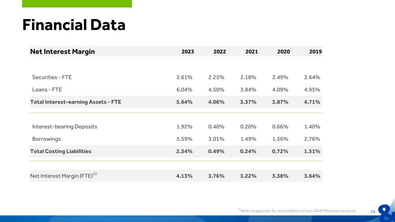 Net Interest Margin 2023 2022 2021 2020 2019 Securities - FTE 2.61% 2.25% 2.18% 2.49% 2.64% Loans - FTE 6.04% 4.50% 3.84% 4.09% 4.95% Total Interest-earning Assets - FTE 5.64% 4.06% 3.37% 3.87% 4.71% Interest-bearing Deposits 1.92% 0.40% 0.20% 0.66% 1.40% Borrowings 5.59% 3.01% 1.49% 1.56% 2.76% Total Costing Liabilities 2.34% 0.49% 0.24% 0.72% 1.51% Net Interest Margin (FTE)(1) 4.13% 3.76% 3.22% 3.38% 3.64% Financial Data (1)Refer to appendix for reconciliation of non-GAAP financial measures 26