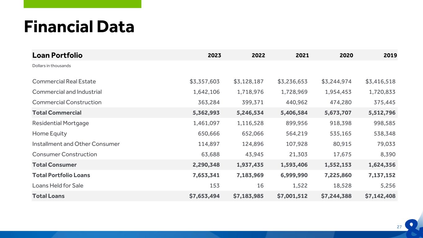 Financial Data 27 Loan Portfolio 2023 2022 2021 2020 2019 Dollars in thousands Commercial Real Estate $3,357,603 $3,128,187 $3,236,653 $3,244,974 $3,416,518 Commercial and Industrial 1,642,106 1,718,976 1,728,969 1,954,453 1,720,833 Commercial Construction 363,284 399,371 440,962 474,280 375,445 Total Commercial 5,362,993 5,246,534 5,406,584 5,673,707 5,512,796 Residential Mortgage 1,461,097 1,116,528 899,956 918,398 998,585 Home Equity 650,666 652,066 564,219 535,165 538,348 Installment and Other Consumer 114,897 124,896 107,928 80,915 79,033 Consumer Construction 63,688 43,945 21,303 17,675 8,390 Total Consumer 2,290,348 1,937,435 1,593,406 1,552,153 1,624,356 Total Portfolio Loans 7,653,341 7,183,969 6,999,990 7,225,860 7,137,152 Loans Held for Sale 153 16 1,522 18,528 5,256 Total Loans $7,653,494 $7,183,985 $7,001,512 $7,244,388 $7,142,408
