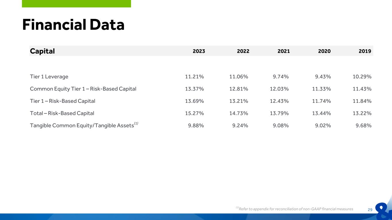Financial Data 29 Capital 2023 2022 2021 2020 2019 Tier 1 Leverage 11.21% 11.06% 9.74% 9.43% 10.29% Common Equity Tier 1 – Risk-Based Capital 13.37% 12.81% 12.03% 11.33% 11.43% Tier 1 – Risk-Based Capital 13.69% 13.21% 12.43% 11.74% 11.84% Total – Risk-Based Capital 15.27% 14.73% 13.79% 13.44% 13.22% Tangible Common Equity/Tangible Assets(1) 9.88% 9.24% 9.08% 9.02% 9.68% (1)Refer to appendix for reconciliation of non-GAAP financial measures