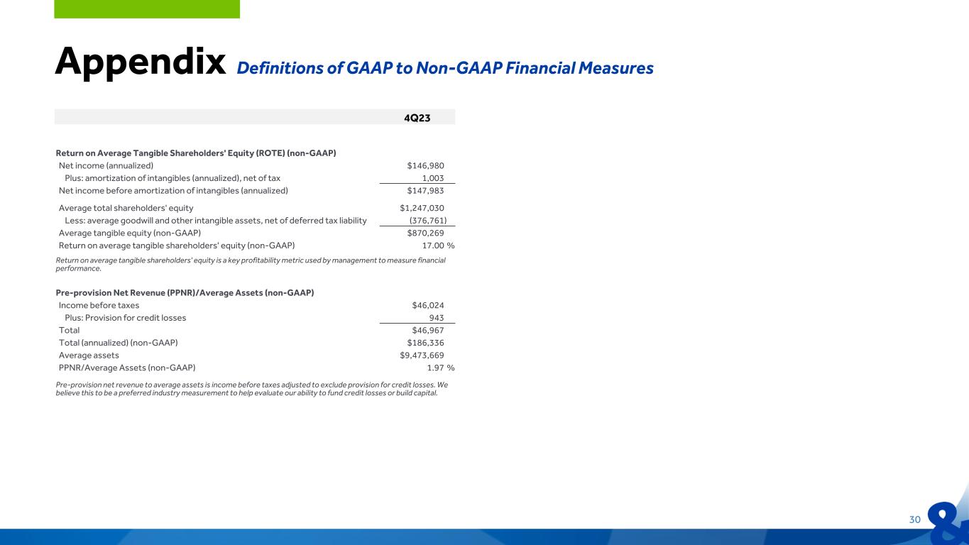 4Q23 Return on Average Tangible Shareholders' Equity (ROTE) (non-GAAP) Net income (annualized) $146,980 Plus: amortization of intangibles (annualized), net of tax 1,003 Net income before amortization of intangibles (annualized) $147,983 Average total shareholders' equity $1,247,030 Less: average goodwill and other intangible assets, net of deferred tax liability (376,761) Average tangible equity (non-GAAP) $870,269 Return on average tangible shareholders' equity (non-GAAP) 17.00 % Return on average tangible shareholders' equity is a key profitability metric used by management to measure financial performance. Pre-provision Net Revenue (PPNR)/Average Assets (non-GAAP) Income before taxes $46,024 Plus: Provision for credit losses 943 Total $46,967 Total (annualized) (non-GAAP) $186,336 Average assets $9,473,669 PPNR/Average Assets (non-GAAP) 1.97 % Pre-provision net revenue to average assets is income before taxes adjusted to exclude provision for credit losses. We believe this to be a preferred industry measurement to help evaluate our ability to fund credit losses or build capital. Appendix Definitions of GAAP to Non-GAAP Financial Measures 30