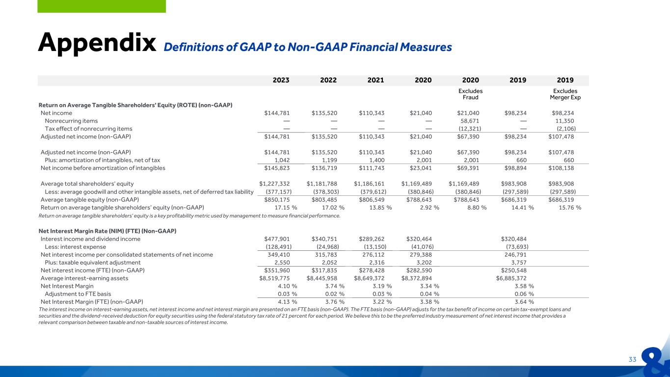 2023 2022 2021 2020 2020 2019 2019 Excludes Fraud Excludes Merger Exp Return on Average Tangible Shareholders' Equity (ROTE) (non-GAAP) Net income $144,781 $135,520 $110,343 $21,040 $21,040 $98,234 $98,234 Nonrecurring items — — — — 58,671 — 11,350 Tax effect of nonrecurring items — — — — (12,321) — (2,106) Adjusted net income (non-GAAP) $144,781 $135,520 $110,343 $21,040 $67,390 $98,234 $107,478 Adjusted net income (non-GAAP) $144,781 $135,520 $110,343 $21,040 $67,390 $98,234 $107,478 Plus: amortization of intangibles, net of tax 1,042 1,199 1,400 2,001 2,001 660 660 Net income before amortization of intangibles $145,823 $136,719 $111,743 $23,041 $69,391 $98,894 $108,138 Average total shareholders' equity $1,227,332 $1,181,788 $1,186,161 $1,169,489 $1,169,489 $983,908 $983,908 Less: average goodwill and other intangible assets, net of deferred tax liability (377,157) (378,303) (379,612) (380,846) (380,846) (297,589) (297,589) Average tangible equity (non-GAAP) $850,175 $803,485 $806,549 $788,643 $788,643 $686,319 $686,319 Return on average tangible shareholders’ equity (non-GAAP) 17.15 % 17.02 % 13.85 % 2.92 % 8.80 % 14.41 % 15.76 % Return on average tangible shareholders' equity is a key profitability metric used by management to measure financial performance. Net Interest Margin Rate (NIM) (FTE) (Non-GAAP) Interest income and dividend income $477,901 $340,751 $289,262 $320,464 $320,484 Less: interest expense (128,491) (24,968) (13,150) (41,076) (73,693) Net interest income per consolidated statements of net income 349,410 315,783 276,112 279,388 246,791 Plus: taxable equivalent adjustment 2,550 2,052 2,316 3,202 3,757 Net interest income (FTE) (non-GAAP) $351,960 $317,835 $278,428 $282,590 $250,548 Average interest-earning assets $8,519,775 $8,445,958 $8,649,372 $8,372,894 $6,885,372 Net Interest Margin 4.10 % 3.74 % 3.19 % 3.34 % 3.58 % Adjustment to FTE basis 0.03 % 0.02 % 0.03 % 0.04 % 0.06 % Net Interest Margin (FTE) (non-GAAP) 4.13 % 3.76 % 3.22 % 3.38 % 3.64 % The interest income on interest-earning assets, net interest income and net interest margin are presented on an FTE basis (non-GAAP). The FTE basis (non-GAAP) adjusts for the tax benefit of income on certain tax-exempt loans and securities and the dividend-received deduction for equity securities using the federal statutory tax rate of 21 percent for each period. We believe this to be the preferred industry measurement of net interest income that provides a relevant comparison between taxable and non-taxable sources of interest income. Appendix Definitions of GAAP to Non-GAAP Financial Measures 33