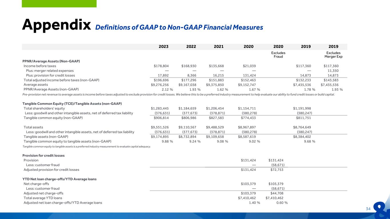2023 2022 2021 2020 2020 2019 2019 Excludes Fraud Excludes Merger Exp PPNR/Average Assets (Non-GAAP) Income before taxes $178,804 $168,930 $135,668 $21,039 $117,360 $117,360 Plus: merger related expenses — — — — — 11,350 Plus: provision for credit losses 17,892 8,366 16,215 131,424 14,873 14,873 Total adjusted income before taxes (non-GAAP) $196,696 $177,296 $151,883 $152,463 $132,233 $143,583 Average assets $9,276,256 $9,167,038 $9,375,850 $9,152,747 $7,435,536 $7,435,536 PPNR/Average Assets (non-GAAP) 2.12 % 1.93 % 1.62 % 1.67 % 1.78 % 1.93 % Pre-provision net revenue to average assets is income before taxes adjusted to exclude provision for credit losses. We believe this to be a preferred industry measurement to help evaluate our ability to fund credit losses or build capital. Tangible Common Equity (TCE)/Tangible Assets (non-GAAP) Total shareholders' equity $1,283,445 $1,184,659 $1,206,454 $1,154,711 $1,191,998 Less: goodwill and other intangible assets, net of deferred tax liability (376,631) (377,673) (378,871) (380,278) (380,247) Tangible common equity (non-GAAP) $906,814 $806,986 $827,583 $774,433 $811,751 Total assets $9,551,526 $9,110,567 $9,488,529 $8,967,897 $8,764,649 Less: goodwill and other intangible assets, net of deferred tax liability (376,631) (377,673) (378,871) (380,278) (380,247) Tangible assets (non-GAAP) $9,174,895 $8,732,894 $9,109,658 $8,587,619 $8,384,402 Tangible common equity to tangible assets (non-GAAP) 9.88 % 9.24 % 9.08 % 9.02 % 9.68 % Tangible common equity to tangible assets is a preferred industry measurement to evaluate capital adequacy. Provision for credit losses Provision $131,424 $131,424 Less: customer fraud — (58,671) Adjusted provision for credit losses $131,424 $72,753 YTD Net loan charge-offs/YTD Average loans Net charge-offs $103,379 $103,379 Less: customer fraud — (58,671) Adjusted net charge-offs $103,379 $44,708 Total average YTD loans $7,410,462 $7,410,462 Adjusted net loan charge-offs/YTD Average loans 1.40 % 0.60 % Appendix Definitions of GAAP to Non-GAAP Financial Measures 34