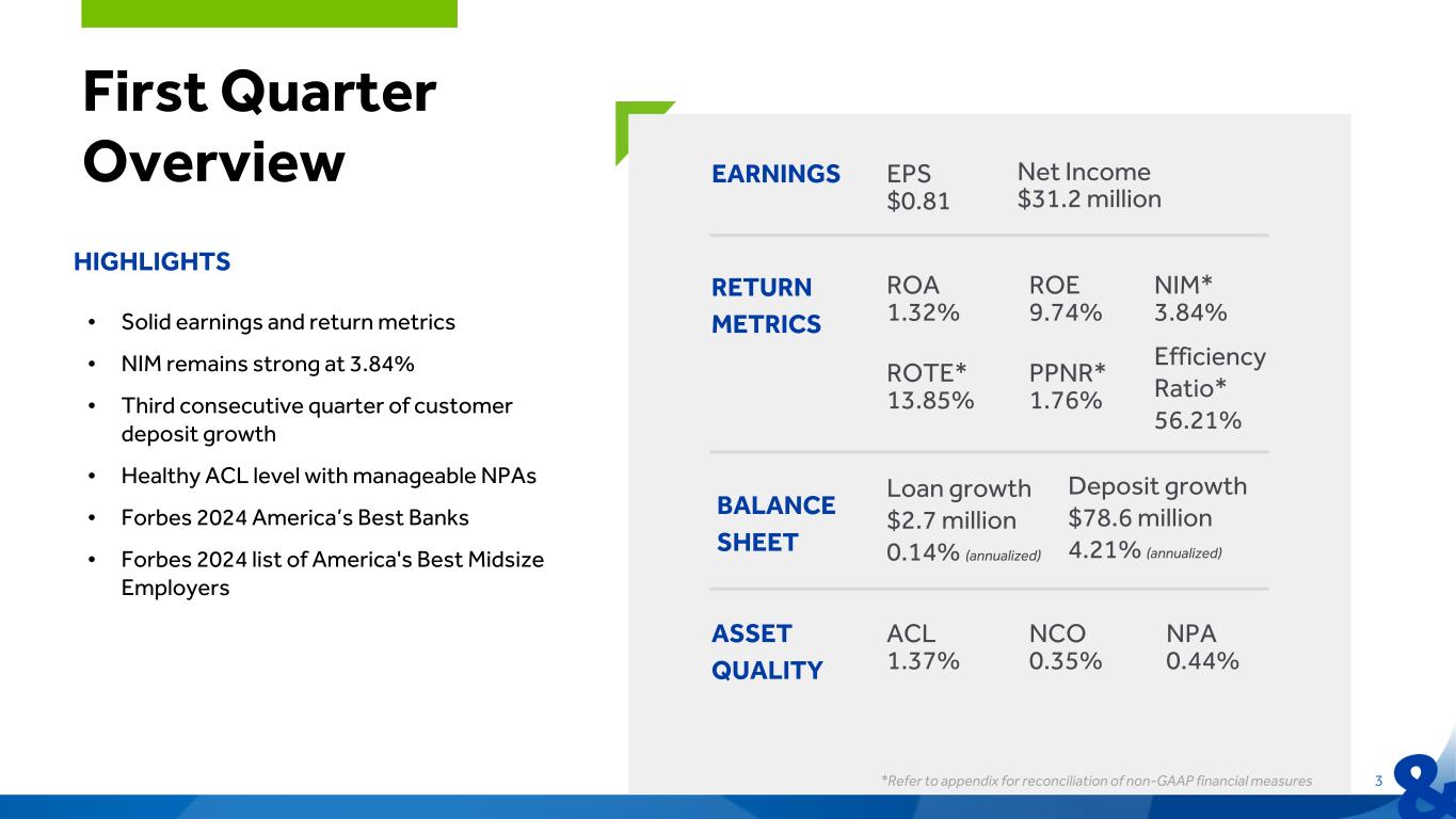 3 First Quarter Overview RETURN METRICS EARNINGS Net Income $31.2 million *Refer to appendix for reconciliation of non-GAAP financial measures EPS $0.81 ROA 1.32% ROE 9.74% ROTE* 13.85% PPNR* 1.76% HIGHLIGHTS • Solid earnings and return metrics • NIM remains strong at 3.84% • Third consecutive quarter of customer deposit growth • Healthy ACL level with manageable NPAs • Forbes 2024 America’s Best Banks • Forbes 2024 list of America's Best Midsize Employers ACL 1.37% NCO 0.35% ASSET QUALITY NPA 0.44% NIM* 3.84% BALANCE SHEET Loan growth $2.7 million 0.14% (annualized) Deposit growth $78.6 million 4.21% (annualized) Efficiency Ratio* 56.21%