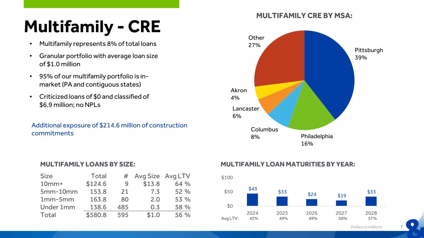 Office CRE Dollars in millions 6 CBD 15% $72 OFFICE LOANS BY SIZE: Size Total # Loans Avg Size Avg LTV 10mm+ $47.3 4 $11.8 53 % 5mm-10mm 172.1 25 6.9 54 % 1mm-5mm 176.1 79 2.2 59 % Under 1mm 86.5 338 0.3 48 % Total $482.0 446 $1.1 55 % OFFICE LOAN MATURITIES BY YEAR: Avg LTV: 52% 56% 50% 55% 49% OFFICE CRE BY MSA: Pittsburgh 37% Philadelphia 18% Columbus 7% Buffalo 6% Harrisburg 5% Other 27% • Office represents 6% of total loans • Granular portfolio with average loan size of $1.1 million • 95% of our office portfolio is in-market (PA and contiguous states) • 90% non-central business district (CBD) • Criticized of $12.3 million and classified of $2.1 million; only $0.5 million of NPLs
