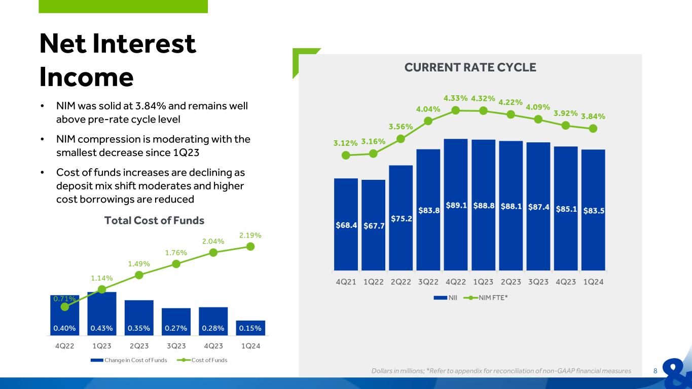 1Q24 4Q23 3Q23 2Q23 1Q23 4Q22 3Q22 2Q22 1Q22 4Q21 Tangible Common Equity (TCE)/Tangible Assets (non-GAAP) Total shareholders' equity $1,295,074 $1,283,445 $1,223,532 $1,212,853 $1,227,795 Less: goodwill and other intangible assets, net of deferred tax liability (376,396) (376,631) (376,883) (377,144) (377,405) Tangible common equity (non-GAAP) $918,678 $906,814 $846,649 $835,709 $850,390 Total assets $9,539,103 $9,551,526 $9,466,077 $9,252,922 $9,193,442 Less: goodwill and other intangible assets, net of deferred tax liability (376,396) (376,631) (376,883) (377,144) (377,405) Tangible assets (non-GAAP) $9,162,707 $9,174,895 $9,089,194 $8,875,778 $8,816,037 Tangible common equity to tangible assets (non-GAAP) 10.03 % 9.88 % 9.31 % 9.42 % 9.65 % Tangible common equity to tangible assets is a preferred industry measurement to evaluate capital adequacy. Efficiency Ratio (non-GAAP) Noninterest expense $54,520 $56,203 $52,799 $49,633 $51,699 Net interest income $83,477 $85,109 $87,387 $88,123 $88,791 Plus: taxable equivalent adjustment 692 683 674 639 555 Net interest income (FTE) (non-GAAP) 84,169 85,792 88,061 88,762 89,346 Noninterest income 12,830 18,061 12,178 14,191 13,190 Less: net gains on sale of securities (3) — — — — Net interest income (FTE) (non-GAAP) plus noninterest income $96,996 $103,853 $100,239 $102,953 $102,536 Efficiency ratio (non-GAAP) 56.21 % 54.12 % 52.67 % 48.21 % 50.42 % The efficiency ratio is noninterest expense divided by noninterest income plus net interest income, on an FTE basis (non-GAAP), which ensures comparability of net interest income arising from both taxable and tax-exempt sources and is consistent with industry practice. Net Interest Margin Rate (NIM) (FTE) (non-GAAP) Interest income and dividend income $127,754 $126,706 $122,959 $117,333 $110,903 $103,208 $89,835 $77,599 $70,109 $71,135 Less: interest expense (44,277) (41,597) (35,572) (29,210) (22,112) (14,150) (6,037) (2,405) (2,376) (2,697) Net interest income 83,477 85,109 87,387 88,123 88,791 89,058 83,798 75,194 67,733 68,438 Plus: taxable equivalent adjustment 692 683 674 639 555 532 521 506 493 510 Net interest income (FTE) (non-GAAP) $84,169 $85,792 $88,061 $88,762 $89,346 $89,590 $84,319 $75,700 $68,226 $68,948 Net interest income (FTE) (annualized) $338,526 $340,370 $349,373 $356,022 $362,348 $355,438 $334,526 $303,633 $276,694 $273,537 Average interest-earning assets $8,801,163 $8,704,727 $8,561,578 $8,436,490 $8,372,193 $8,220,689 $8,287,889 $8,535,384 $8,747,398 $8,768,329 Net interest margin (FTE) (non-GAAP) 3.84 % 3.92 % 4.09 % 4.22 % 4.32 % 4.33 % 4.04 % 3.56 % 3.16 % 3.12 % The interest income on interest-earning assets, net interest income and net interest margin are presented on an FTE basis (non-GAAP). The FTE basis (non-GAAP) adjusts for the tax benefit of income on certain tax-exempt loans and securities and the dividend-received deduction for equity securities using the federal statutory tax rate of 21 percent for each period. We believe this to be the preferred industry measurement of net interest income that provides a relevant comparison between taxable and non-taxable sources of interest income. Appendix Definitions of GAAP to Non-GAAP Financial Measures 13