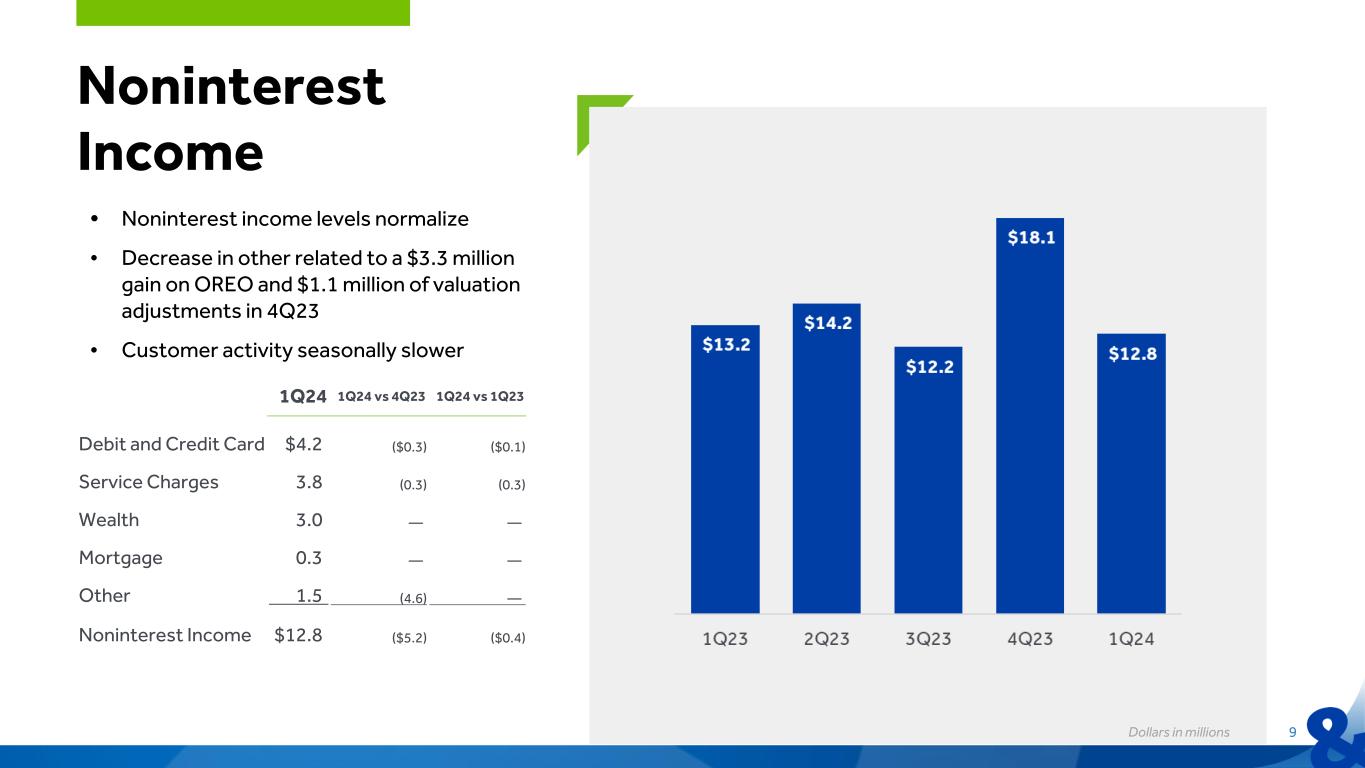 • NIM was solid at 3.84% and remains well above pre-rate cycle level • NIM compression is moderating with the smallest decrease since 1Q23 • Cost of funds increases are declining as deposit mix shift moderates and higher cost borrowings are reduced Net Interest Income Dollars in millions; *Refer to appendix for reconciliation of non-GAAP financial measures 8 CURRENT RATE CYCLE Total Cost of Funds