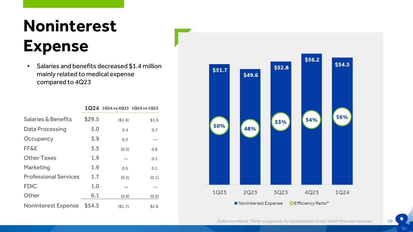 1Q24 1Q24 vs 4Q23 1Q24 vs 1Q23 Debit and Credit Card $4.2 ($0.3) ($0.1) Service Charges 3.8 (0.3) (0.3) Wealth 3.0 — — Mortgage 0.3 — — Other 1.5 (4.6) — Noninterest Income $12.8 ($5.2) ($0.4) Noninterest Income 9Dollars in millions • Noninterest income levels normalize • Decrease in other related to a $3.3 million gain on OREO and $1.1 million of valuation adjustments in 4Q23 • Customer activity seasonally slower