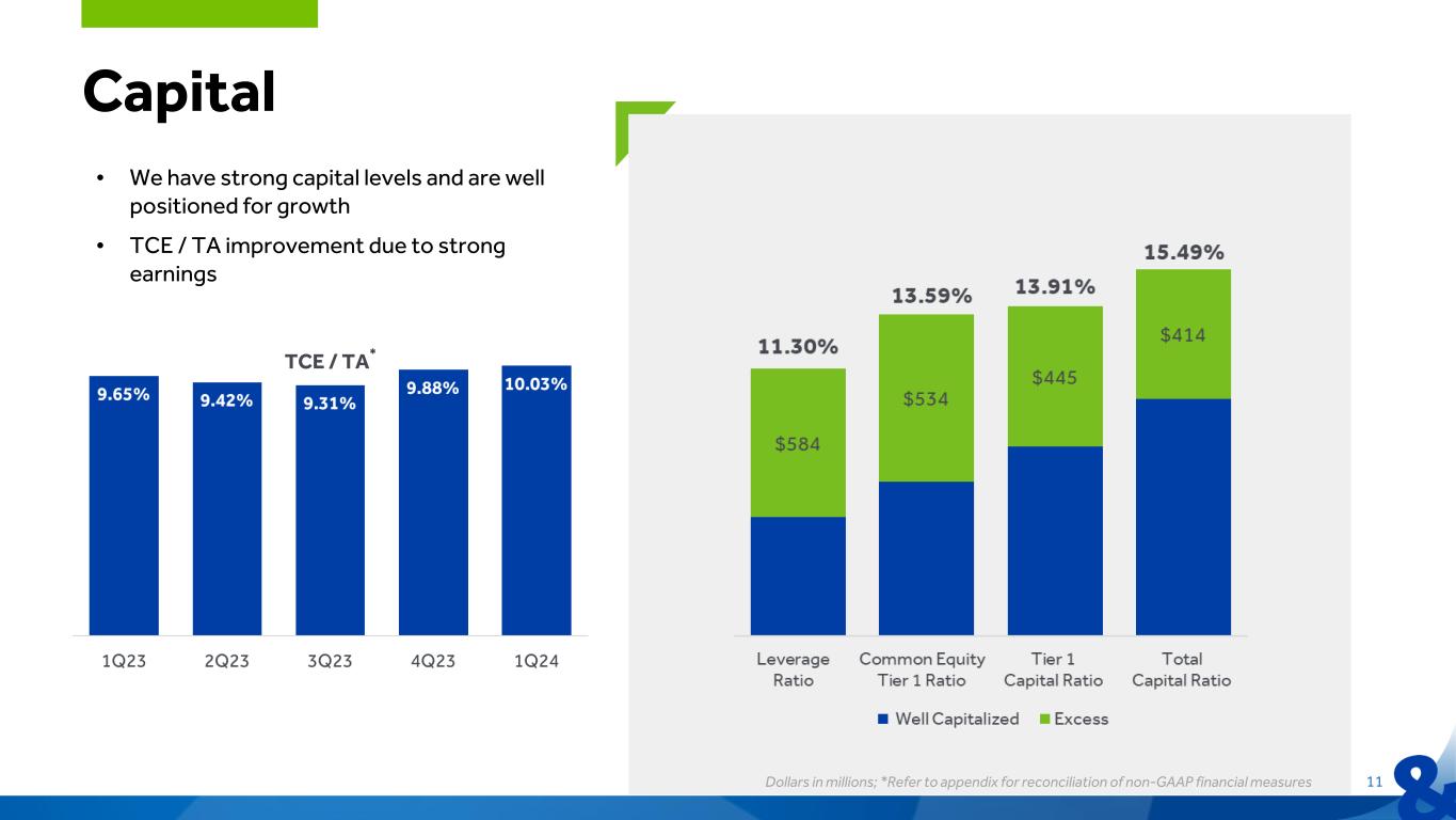 1Q24 1Q24 vs 4Q23 1Q24 vs 1Q23 Salaries & Benefits $29.5 ($1.4) $1.9 Data Processing 5.0 0.4 0.7 Occupancy 3.9 0.3 — FF&E 3.5 (0.3) 0.6 Other Taxes 1.9 — 0.1 Marketing 1.9 0.5 0.1 Professional Services 1.7 (0.3) (0.1) FDIC 1.0 — — Other 6.1 (0.9) (0.6) Noninterest Expense $54.5 ($1.7) $2.8 Noninterest Expense 10Dollars in millions; *Refer to appendix for reconciliation of non-GAAP financial measures • Salaries and benefits decreased $1.4 million mainly related to medical expense compared to 4Q23