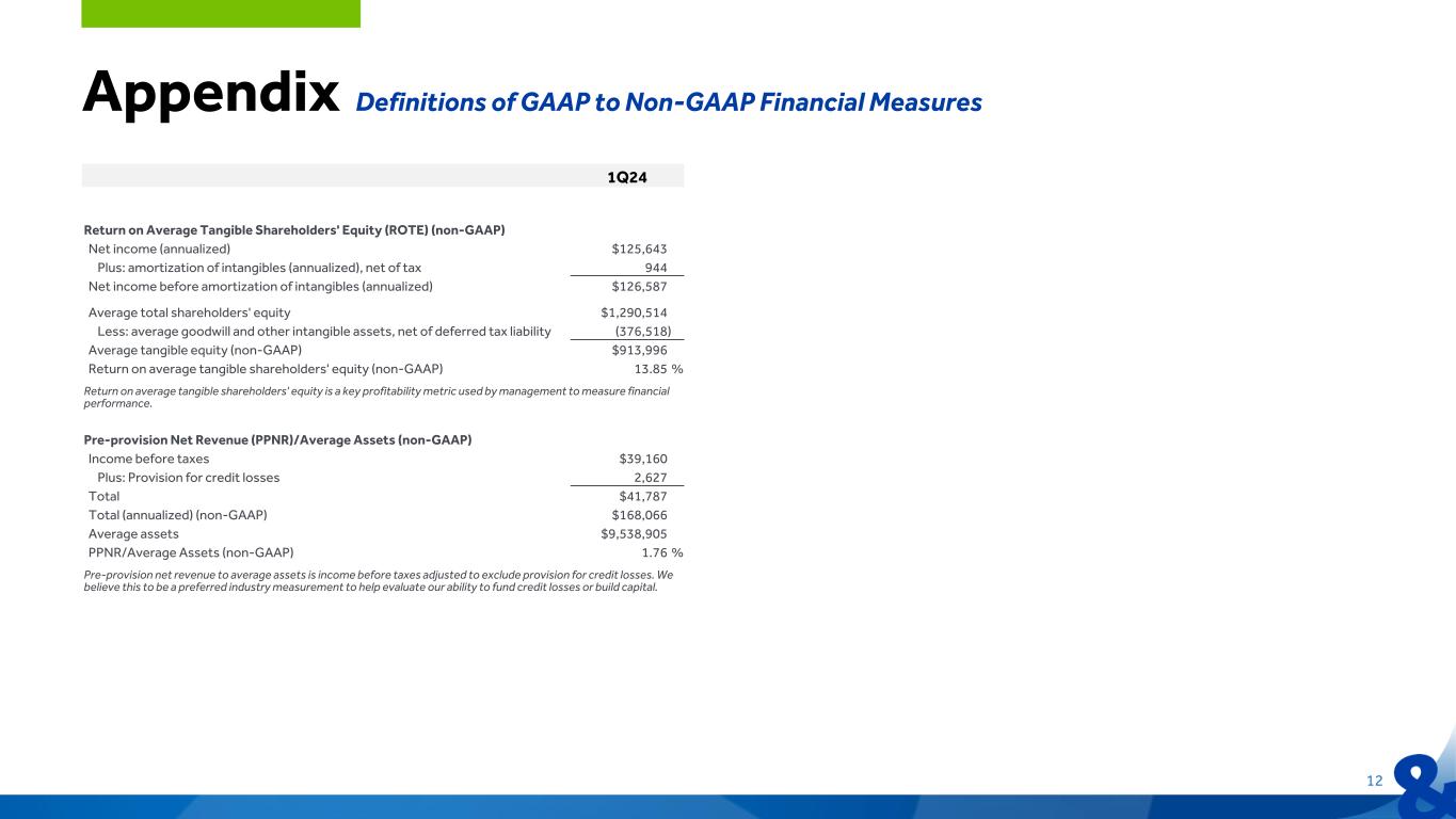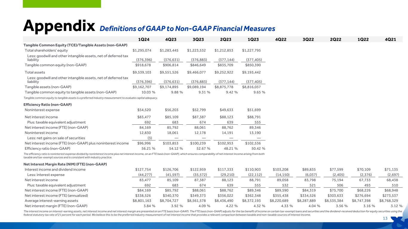 1Q24 Return on Average Tangible Shareholders' Equity (ROTE) (non-GAAP) Net income (annualized) $125,643 Plus: amortization of intangibles (annualized), net of tax 944 Net income before amortization of intangibles (annualized) $126,587 Average total shareholders' equity $1,290,514 Less: average goodwill and other intangible assets, net of deferred tax liability (376,518) Average tangible equity (non-GAAP) $913,996 Return on average tangible shareholders' equity (non-GAAP) 13.85 % Return on average tangible shareholders' equity is a key profitability metric used by management to measure financial performance. Pre-provision Net Revenue (PPNR)/Average Assets (non-GAAP) Income before taxes $39,160 Plus: Provision for credit losses 2,627 Total $41,787 Total (annualized) (non-GAAP) $168,066 Average assets $9,538,905 PPNR/Average Assets (non-GAAP) 1.76 % Pre-provision net revenue to average assets is income before taxes adjusted to exclude provision for credit losses. We believe this to be a preferred industry measurement to help evaluate our ability to fund credit losses or build capital. Appendix Definitions of GAAP to Non-GAAP Financial Measures 12