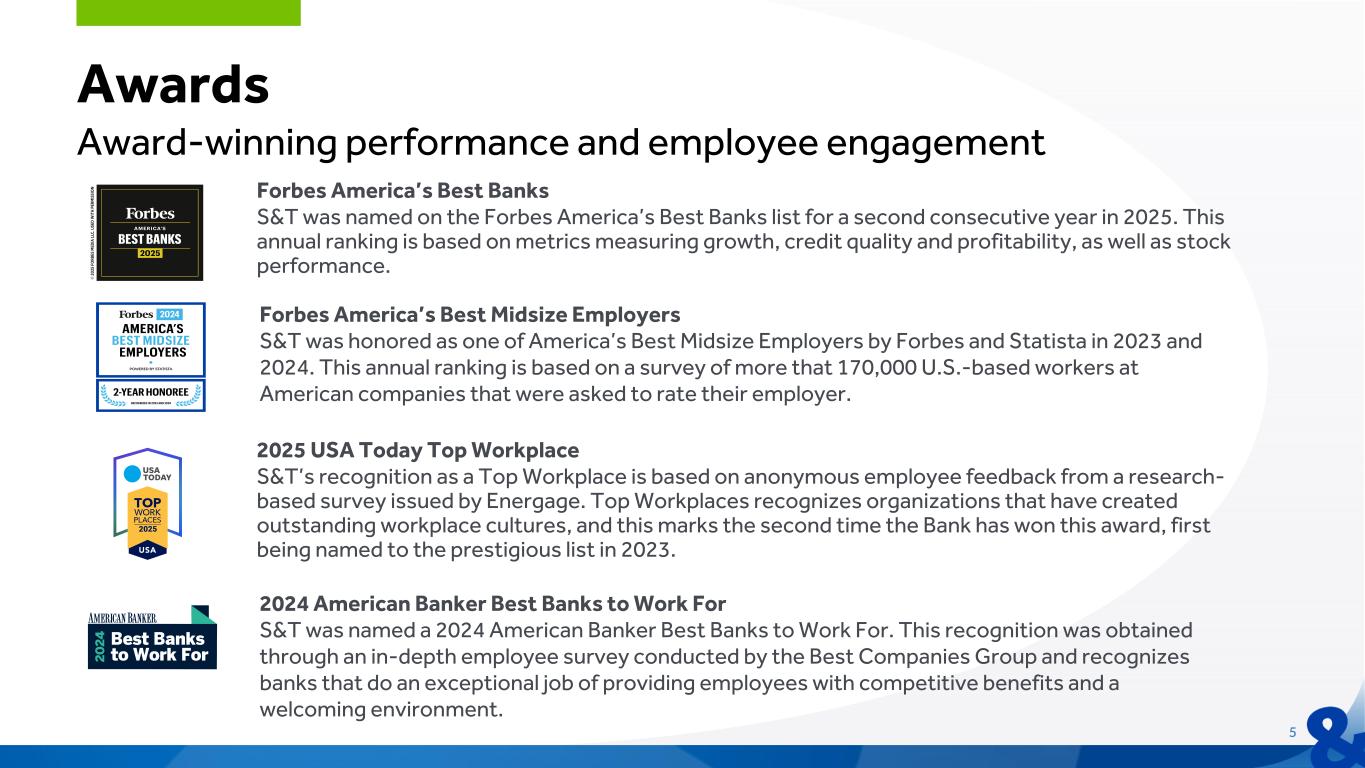 Awards Award-winning performance and employee engagement 5 Forbes America’s Best Banks S&T was named on the Forbes America’s Best Banks list for a second consecutive year in 2025. This annual ranking is based on metrics measuring growth, credit quality and profitability, as well as stock performance. 2024 American Banker Best Banks to Work For S&T was named a 2024 American Banker Best Banks to Work For. This recognition was obtained through an in-depth employee survey conducted by the Best Companies Group and recognizes banks that do an exceptional job of providing employees with competitive benefits and a welcoming environment. 2025 USA Today Top Workplace S&T’s recognition as a Top Workplace is based on anonymous employee feedback from a research- based survey issued by Energage. Top Workplaces recognizes organizations that have created outstanding workplace cultures, and this marks the second time the Bank has won this award, first being named to the prestigious list in 2023. Forbes America’s Best Midsize Employers S&T was honored as one of America’s Best Midsize Employers by Forbes and Statista in 2023 and 2024. This annual ranking is based on a survey of more that 170,000 U.S.-based workers at American companies that were asked to rate their employer.
