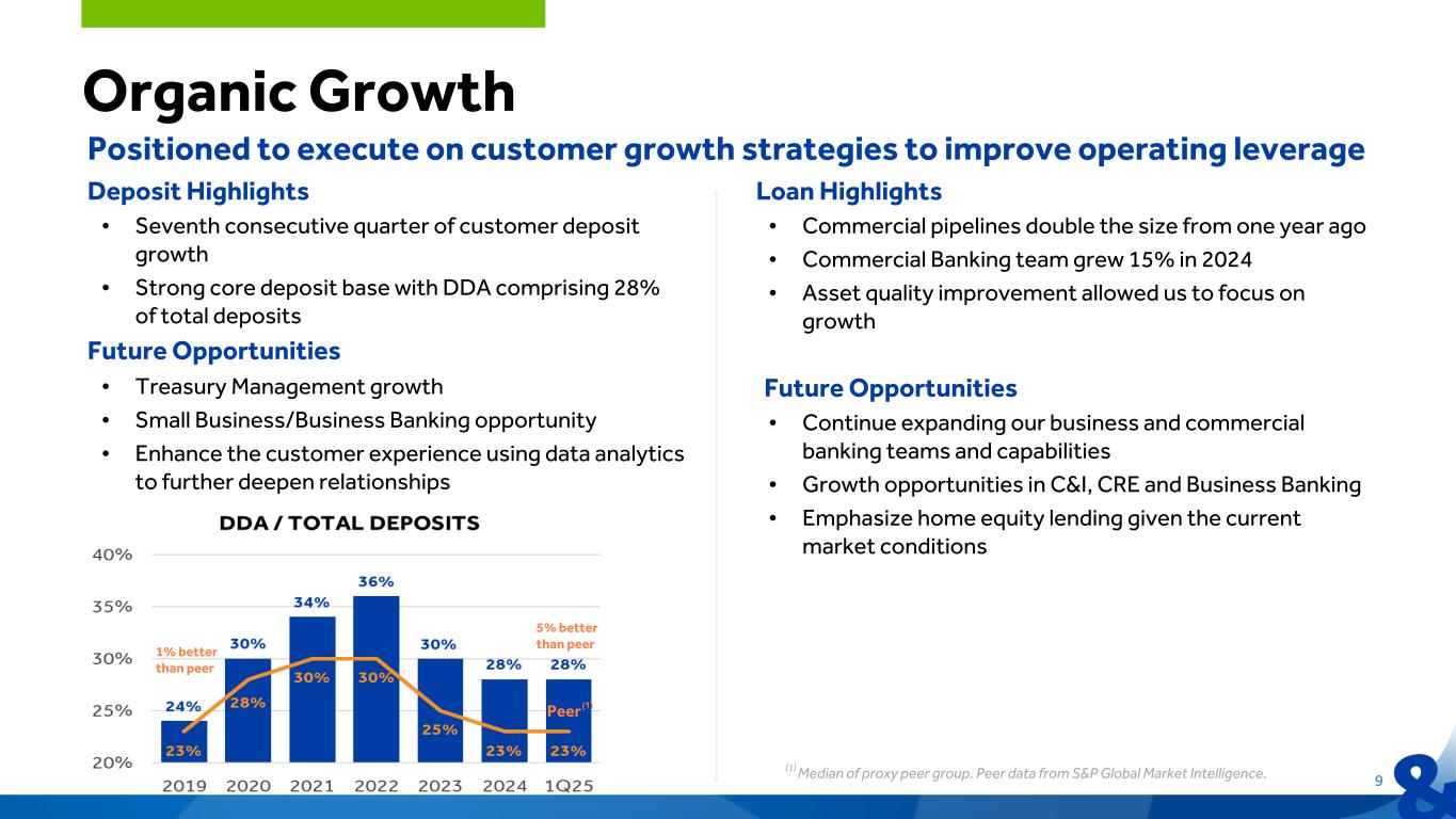 Loan Highlights • Commercial pipelines double the size from one year ago • Commercial Banking team grew 15% in 2024 • Asset quality improvement allowed us to focus on growth Future Opportunities • Continue expanding our business and commercial banking teams and capabilities • Growth opportunities in C&I, CRE and Business Banking • Emphasize home equity lending given the current market conditions 9 Organic Growth Positioned to execute on customer growth strategies to improve operating leverage (1) Median of proxy peer group. Peer data from S&P Global Market Intelligence. Deposit Highlights • Seventh consecutive quarter of customer deposit growth • Strong core deposit base with DDA comprising 28% of total deposits Future Opportunities • Treasury Management growth • Small Business/Business Banking opportunity • Enhance the customer experience using data analytics to further deepen relationships 5% better than peer1% better than peer (1)Peer