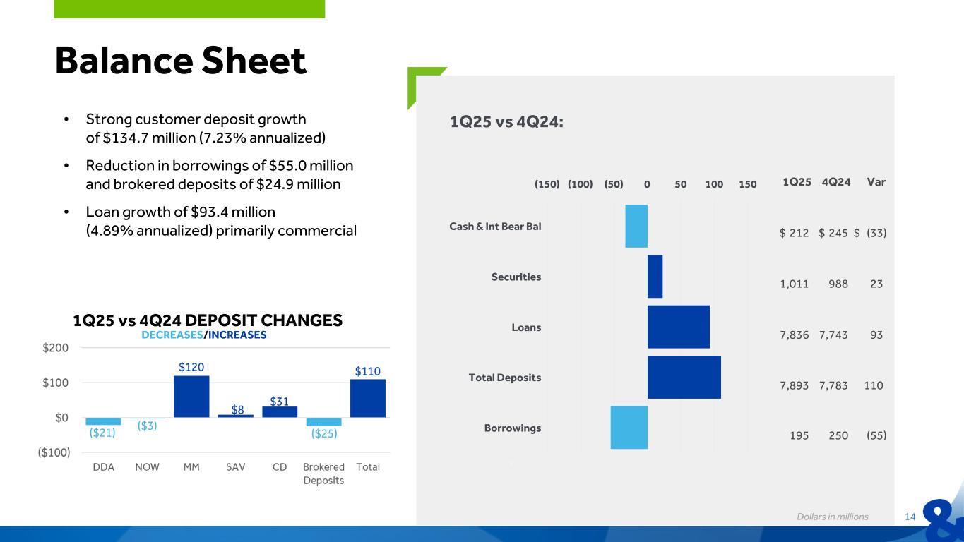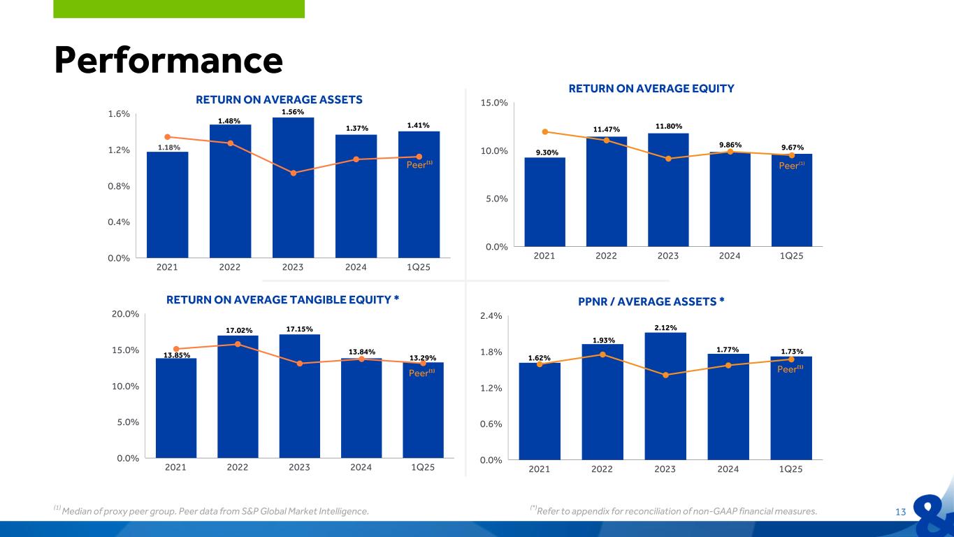 PPNR / AVERAGE ASSETS * 2021 2022 2023 2024 1Q25 0.0% 0.6% 1.2% 1.8% 2.4% RETURN ON AVERAGE TANGIBLE EQUITY * 2021 2022 2023 2024 1Q25 0.0% 5.0% 10.0% 15.0% 20.0% RETURN ON AVERAGE ASSETS 2021 2022 2023 2024 1Q25 0.0% 0.4% 0.8% 1.2% 1.6% RETURN ON AVERAGE EQUITY 2021 2022 2023 2024 1Q25 0.0% 5.0% 10.0% 15.0% Performance 13 1.48% 1.41% 11.47% 9.30% 9.86% 1.62% 2.12% 1.77% 17.02% 13.85% (1) Median of proxy peer group. Peer data from S&P Global Market Intelligence. (*)Refer to appendix for reconciliation of non-GAAP financial measures. 1.56% 11.80% 17.15% 1.93% 1.73% 9.67% 13.84% 13.29% Peer(1) Peer(1) Peer(1) Peer(1) 1.37% 1.18%