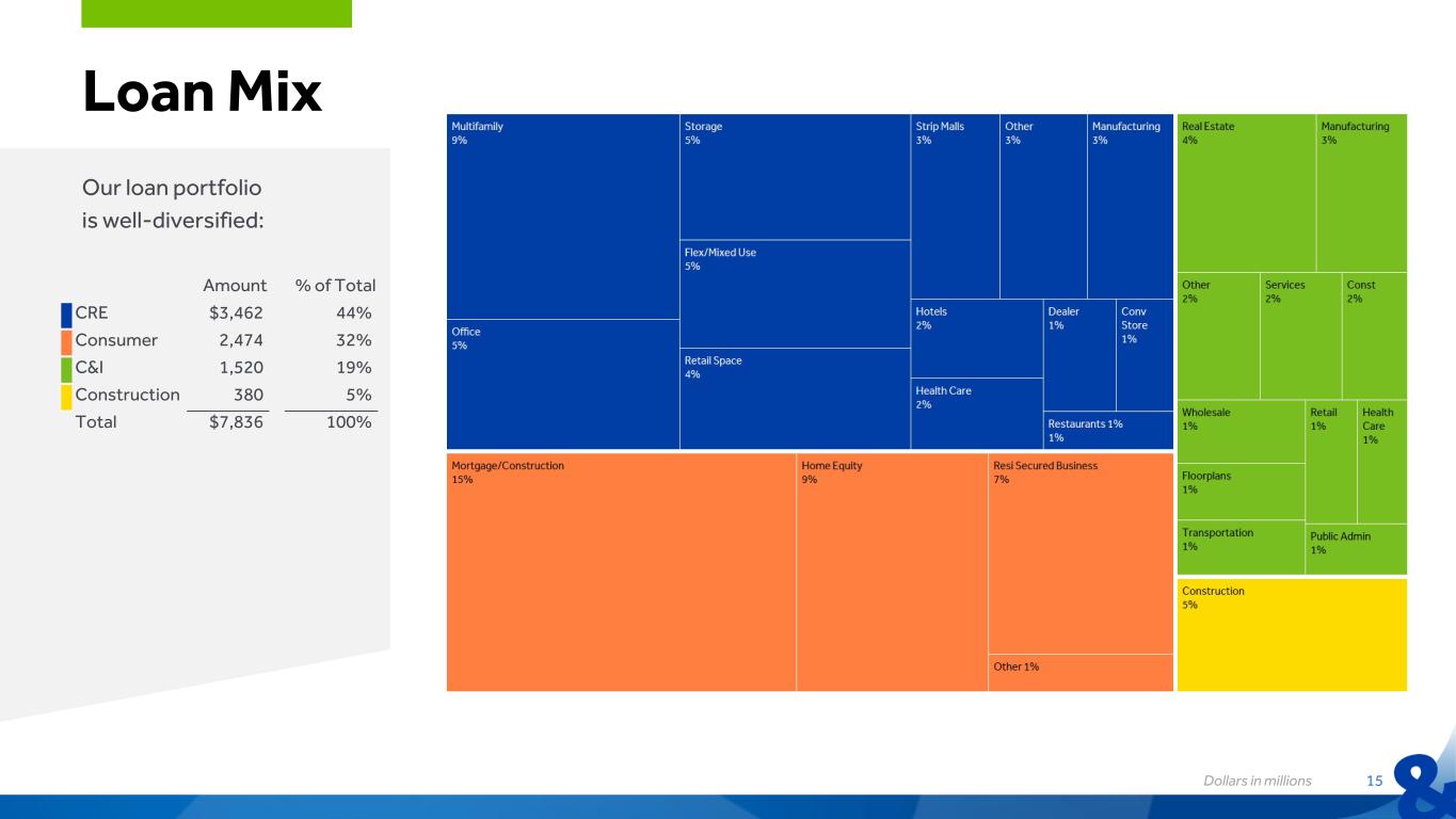 Loan Mix Our loan portfolio is well-diversified: Dollars in millions 15 Amount % of Total CRE $3,462 44% Consumer 2,474 32% C&I 1,520 19% Construction 380 5% Total $7,836 100%