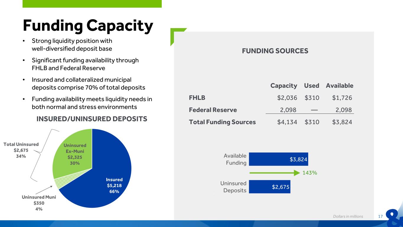 Deposit Mix We have a strong, well-diversified deposit base of more than 200,000 customers: Dollars in millions 16 Amount % of Total DDA $2,164 28% MM 2,210 28% CDs 1,823 23% Savings 886 11% Int Bear DDA 810 10% Total $7,893 100% Amount % of Total Average Account Size (in $000) Average Age (in years) Personal $4,675 59% $18 12 Business 3,018 38% 75 10 Brokered 200 3% — — Total $7,893 100% $26 12 Brokered 1% Business 1% Brok 1%
