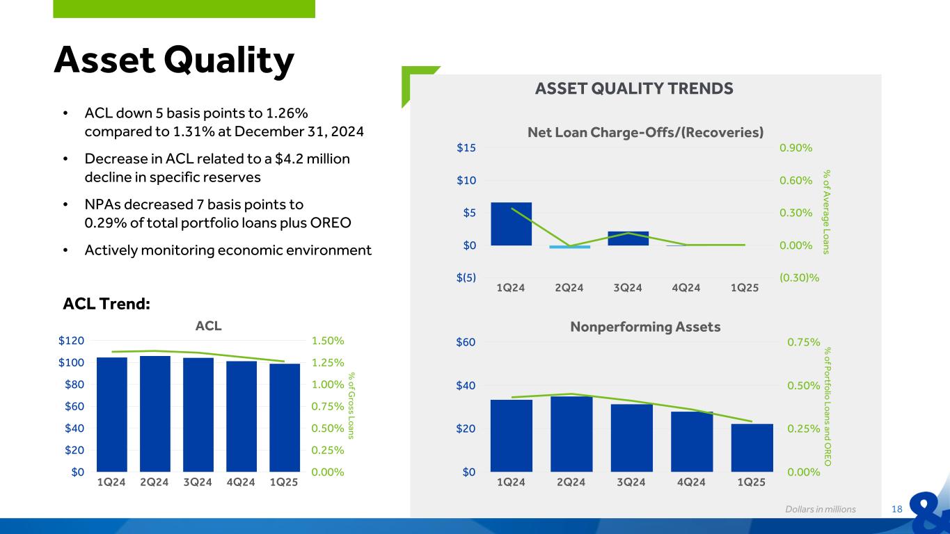 Asset Quality 1Q25 2024 2023 2022 2021 (Dollars in thousands) Total Nonaccrual Loans $22,339 $27,937 $22,946 $19,052 $66,291 Nonaccrual Loans/Total Loans 0.29% 0.36% 0.30% 0.27% 0.95% Nonperforming Assets/Total Loans + OREO 0.29% 0.36% 0.30% 0.31% 1.13% Net Charge-offs/Average Loans(1) (—%) 0.11% 0.18% 0.04% 0.49% Allowance for Credit Losses/Total Portfolio Loans 1.26% 1.31% 1.41% 1.41% 1.41% Allowance for Credit Losses/Nonaccrual Loans 443% 363% 471% 532% 149% Financial Data 28(1) 1Q25 Annualized