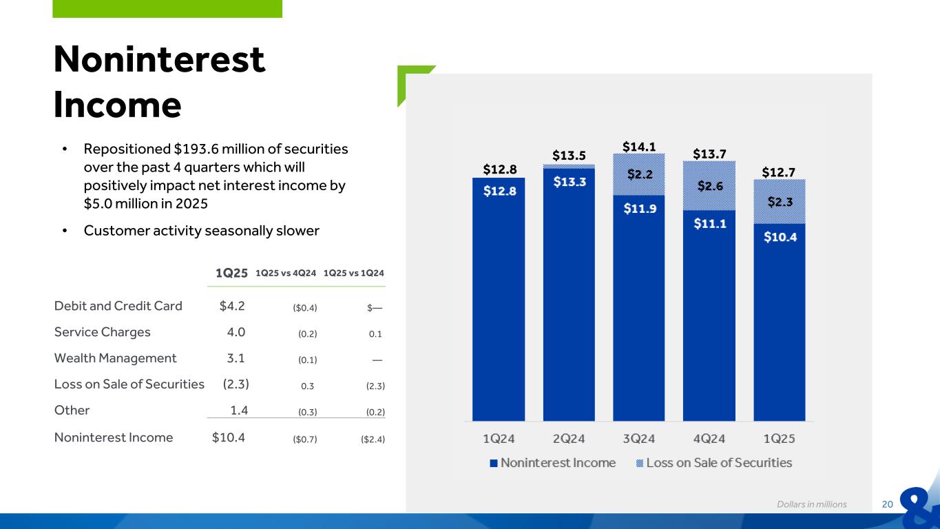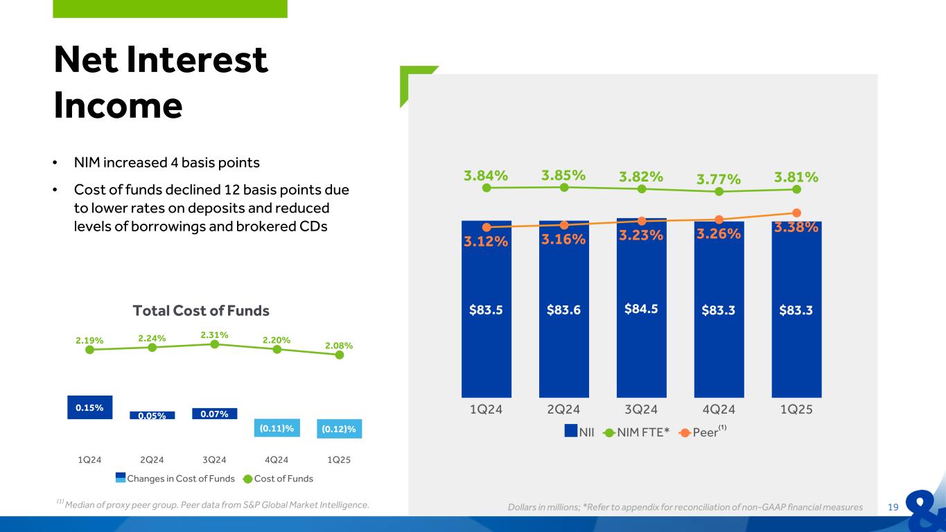 18 Asset Quality ACL Trend: Dollars in millions ASSET QUALITY TRENDS • ACL down 5 basis points to 1.26% compared to 1.31% at December 31, 2024 • Decrease in ACL related to a $4.2 million decline in specific reserves • NPAs decreased 7 basis points to 0.29% of total portfolio loans plus OREO • Actively monitoring economic environment % o f A verage Lo ans Net Loan Charge-Offs/(Recoveries) 1Q24 2Q24 3Q24 4Q24 1Q25 $(5) $0 $5 $10 $15 (0.30)% 0.00% 0.30% 0.60% 0.90% % o f Po rtfo lio Lo ans and O R EO Nonperforming Assets 1Q24 2Q24 3Q24 4Q24 1Q25 $0 $20 $40 $60 0.00% 0.25% 0.50% 0.75% % o f G ro ss Lo ans ACL 1Q24 2Q24 3Q24 4Q24 1Q25 $0 $20 $40 $60 $80 $100 $120 0.00% 0.25% 0.50% 0.75% 1.00% 1.25% 1.50%