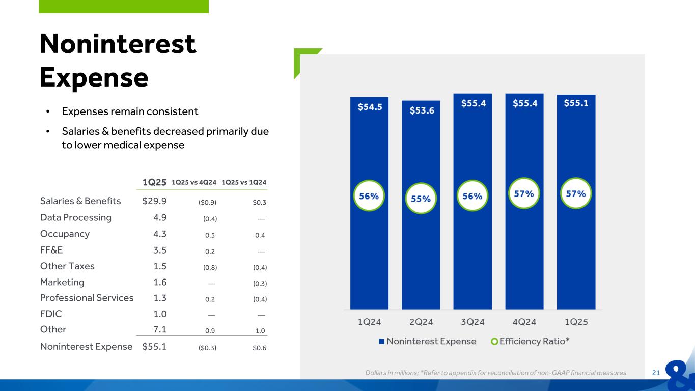 20 1Q25 1Q25 vs 4Q24 1Q25 vs 1Q24 Debit and Credit Card $4.2 ($0.4) $— Service Charges 4.0 (0.2) 0.1 Wealth Management 3.1 (0.1) — Loss on Sale of Securities (2.3) 0.3 (2.3) Other 1.4 (0.3) (0.2) Noninterest Income $10.4 ($0.7) ($2.4) Noninterest Income Dollars in millions • Repositioned $193.6 million of securities over the past 4 quarters which will positively impact net interest income by $5.0 million in 2025 • Customer activity seasonally slower $12.8 $13.5 $14.1 $13.7 $12.7