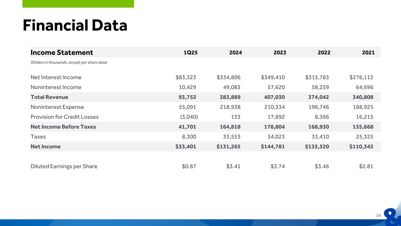 Income Statement 1Q25 2024 2023 2022 2021 (Dollars in thousands, except per share data) Net Interest Income $83,323 $334,806 $349,410 $315,783 $276,112 Noninterest Income 10,429 49,083 57,620 58,259 64,696 Total Revenue 93,752 383,889 407,030 374,042 340,808 Noninterest Expense 55,091 218,938 210,334 196,746 188,925 Provision for Credit Losses (3,040) 133 17,892 8,366 16,215 Net Income Before Taxes 41,701 164,818 178,804 168,930 135,668 Taxes 8,300 33,553 34,023 33,410 25,325 Net Income $33,401 $131,265 $144,781 $135,520 $110,343 Diluted Earnings per Share $0.87 $3.41 $3.74 $3.46 $2.81 Financial Data 24