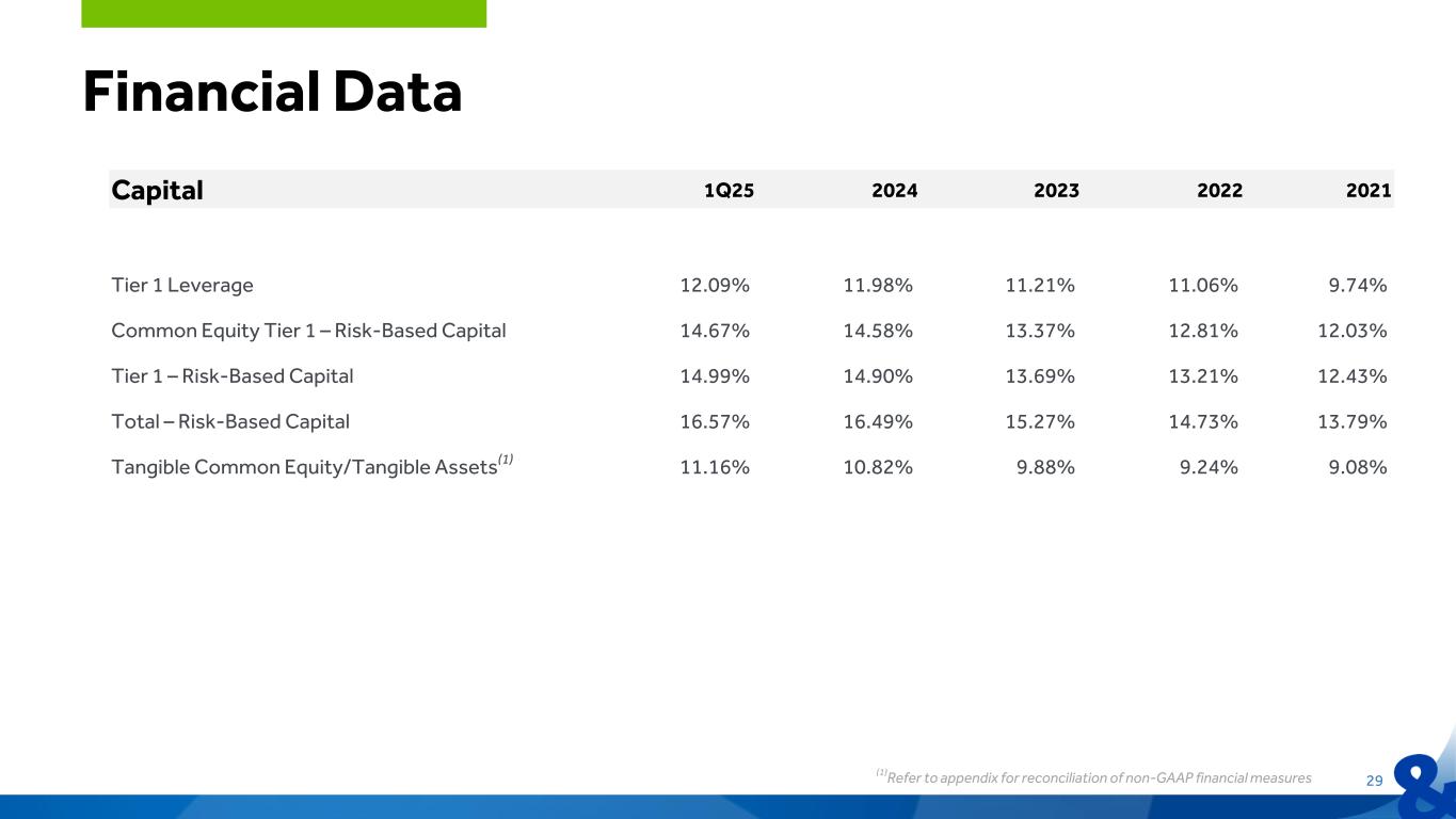 Capital 1Q25 2024 2023 2022 2021 Tier 1 Leverage 12.09% 11.98% 11.21% 11.06% 9.74% Common Equity Tier 1 – Risk-Based Capital 14.67% 14.58% 13.37% 12.81% 12.03% Tier 1 – Risk-Based Capital 14.99% 14.90% 13.69% 13.21% 12.43% Total – Risk-Based Capital 16.57% 16.49% 15.27% 14.73% 13.79% Tangible Common Equity/Tangible Assets(1) 11.16% 10.82% 9.88% 9.24% 9.08% Financial Data 29 (1)Refer to appendix for reconciliation of non-GAAP financial measures