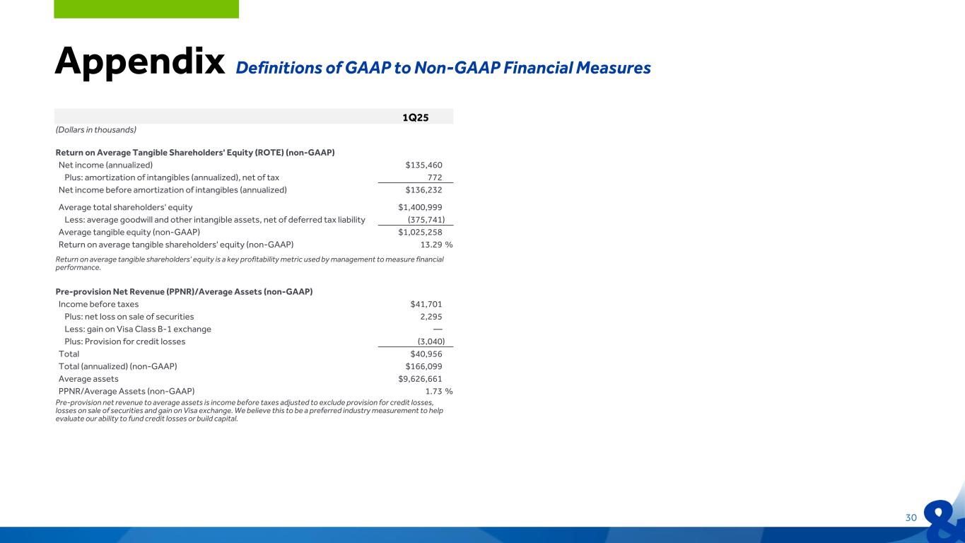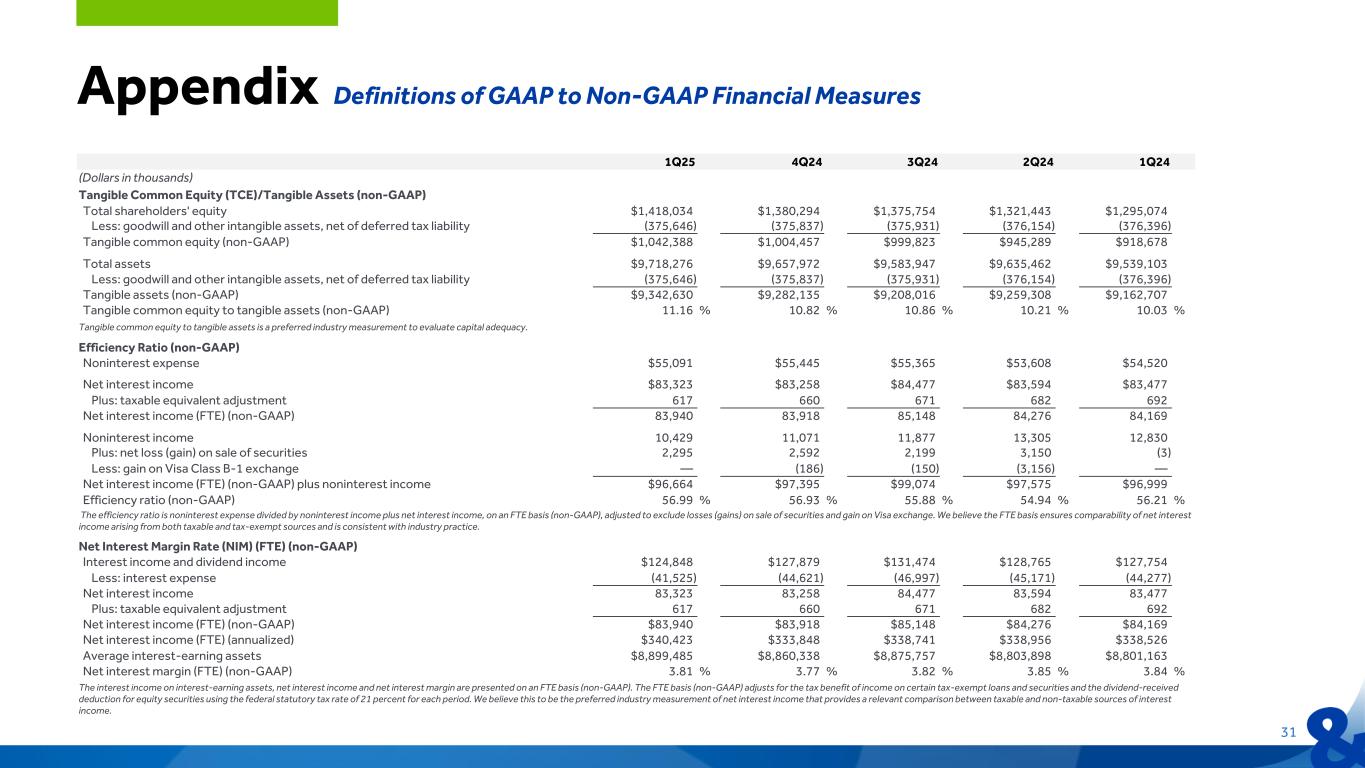 1Q25 (Dollars in thousands) Return on Average Tangible Shareholders' Equity (ROTE) (non-GAAP) Net income (annualized) $135,460 Plus: amortization of intangibles (annualized), net of tax 772 Net income before amortization of intangibles (annualized) $136,232 Average total shareholders' equity $1,400,999 Less: average goodwill and other intangible assets, net of deferred tax liability (375,741) Average tangible equity (non-GAAP) $1,025,258 Return on average tangible shareholders' equity (non-GAAP) 13.29 % Return on average tangible shareholders' equity is a key profitability metric used by management to measure financial performance. Pre-provision Net Revenue (PPNR)/Average Assets (non-GAAP) Income before taxes $41,701 Plus: net loss on sale of securities 2,295 Less: gain on Visa Class B-1 exchange — Plus: Provision for credit losses (3,040) Total $40,956 Total (annualized) (non-GAAP) $166,099 Average assets $9,626,661 PPNR/Average Assets (non-GAAP) 1.73 % Pre-provision net revenue to average assets is income before taxes adjusted to exclude provision for credit losses, losses on sale of securities and gain on Visa exchange. We believe this to be a preferred industry measurement to help evaluate our ability to fund credit losses or build capital. Appendix Definitions of GAAP to Non-GAAP Financial Measures 30
