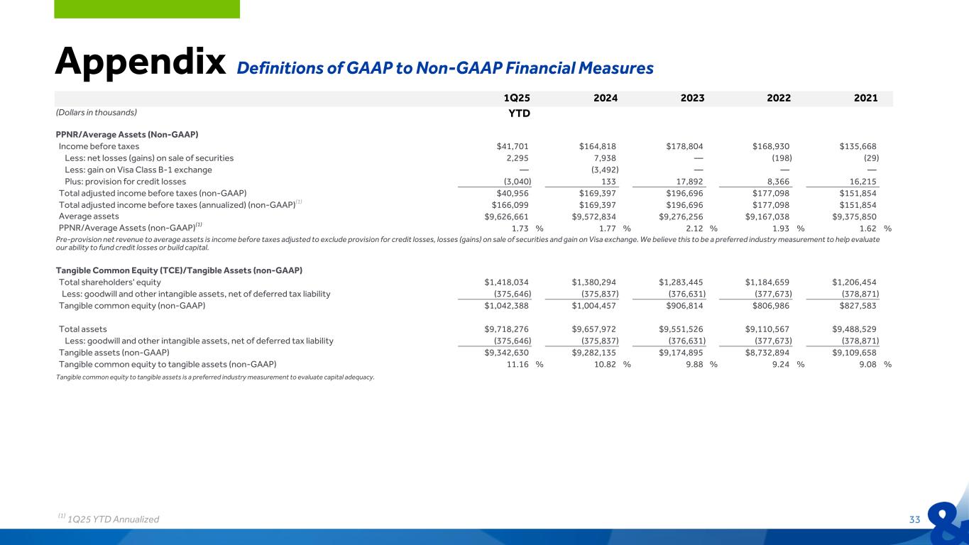 1Q25 2024 2023 2022 2021 (Dollars in thousands) YTD PPNR/Average Assets (Non-GAAP) Income before taxes $41,701 $164,818 $178,804 $168,930 $135,668 Less: net losses (gains) on sale of securities 2,295 7,938 — (198) (29) Less: gain on Visa Class B-1 exchange — (3,492) — — — Plus: provision for credit losses (3,040) 133 17,892 8,366 16,215 Total adjusted income before taxes (non-GAAP) $40,956 $169,397 $196,696 $177,098 $151,854 Total adjusted income before taxes (annualized) (non-GAAP)(1) $166,099 $169,397 $196,696 $177,098 $151,854 Average assets $9,626,661 $9,572,834 $9,276,256 $9,167,038 $9,375,850 PPNR/Average Assets (non-GAAP)(1) 1.73 % 1.77 % 2.12 % 1.93 % 1.62 % Pre-provision net revenue to average assets is income before taxes adjusted to exclude provision for credit losses, losses (gains) on sale of securities and gain on Visa exchange. We believe this to be a preferred industry measurement to help evaluate our ability to fund credit losses or build capital. Tangible Common Equity (TCE)/Tangible Assets (non-GAAP) Total shareholders' equity $1,418,034 $1,380,294 $1,283,445 $1,184,659 $1,206,454 Less: goodwill and other intangible assets, net of deferred tax liability (375,646) (375,837) (376,631) (377,673) (378,871) Tangible common equity (non-GAAP) $1,042,388 $1,004,457 $906,814 $806,986 $827,583 Total assets $9,718,276 $9,657,972 $9,551,526 $9,110,567 $9,488,529 Less: goodwill and other intangible assets, net of deferred tax liability (375,646) (375,837) (376,631) (377,673) (378,871) Tangible assets (non-GAAP) $9,342,630 $9,282,135 $9,174,895 $8,732,894 $9,109,658 Tangible common equity to tangible assets (non-GAAP) 11.16 % 10.82 % 9.88 % 9.24 % 9.08 % Tangible common equity to tangible assets is a preferred industry measurement to evaluate capital adequacy. Appendix Definitions of GAAP to Non-GAAP Financial Measures 33(1) 1Q25 YTD Annualized
