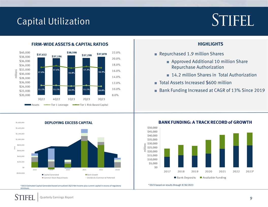 Expenses Non-GAAP EXPENSE RATIOS NON-GAAP EXPENSES & PRE-TAX INCOME 65% 35% millions 3Q23 3Q22 Y/Y Change 63% 30% 61% 25% Compensation $606 $606 0% 59% 20% Non-compensation Expense, 57% 15% $302 $209 44% 58.0% 58.0% 58.0% 58.0% Ex. IB Gross Up & Credit Loss 55% 56.5% 10% Credit Loss Provision & IB Gross Up $14 $12 13% 53% 5% 51% 0% Non-compensation $316 $222 42% 3Q22 4Q22 1Q23 2Q23 3Q23 Pre-tax Income $123 $218 -43% Non-compensation Operating Ratio IB Gross up & Loan Loss Provision Compensation Ratio ANNUAL GAAP to Non-GAAP RESULTS GAAP to Non-GAAP RECONCILIATION $900 $800 (000s) 3Q23 $700 $600 GAAP Net Income $68,161 $500 $400 Preferred Dividend $9,321 $300 $200 Net Income available to common Shareholders $58,840 $100 $0 Non-GAAP After Tax Adjustments $8,573 2019 2020 2021 2022 2023* Non-GAAP Net Income Available to Common $67,413 Shareholders GAAP Net Income Available to Common Shareholders Non-GAAP After Tax Adjustments * For reconciliation of GAAP to non-GAAP expenses, refer to our third quarter 2023 earnings release. *2023 annual GAAP to non-GAAP results based on annualized results through 9/30/2023 Quarterly Earnings Report 8 millions Compensation Ratio Non-compensation Ratio