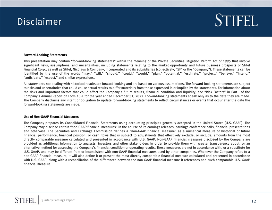 Disclaimer Forward-Looking Statements This presentation may contain “forward-looking statements” within the meaning of the Private Securities Litigation Reform Act of 1995 that involve significant risks, assumptions, and uncertainties, including statements relating to the market opportunity and future business prospects of Stifel Financial Corp., as well as Stifel, Nicolaus & Company, Incorporated and its subsidiaries (collectively, “SF” or the “Company”). These statements can be identified by the use of the words “may,” “will,” “should,” “could,” “would,” “plan,” “potential,” “estimate,” “project,” “believe,” “intend,” “anticipate,” “expect,” and similar expressions. All statements not dealing with historical results are forward-looking and are based on various assumptions. The forward-looking statements are subject to risks and uncertainties that could cause actual results to differ materially from those expressed in or implied by the statements. For information about the risks and important factors that could affect the Company’s future results, financial condition and liquidity, see “Risk Factors” in Part I of the Company’s Annual Report on Form 10-K for the year ended December 31, 2022. Forward-looking statements speak only as to the date they are made. The Company disclaims any intent or obligation to update forward-looking statements to reflect circumstances or events that occur after the date the forward-looking statements are made. Use of Non-GAAP Financial Measures The Company prepares its Consolidated Financial Statements using accounting principles generally accepted in the United States (U.S. GAAP). The Company may disclose certain “non-GAAP financial measures” in the course of its earnings releases, earnings conference calls, financial presentations and otherwise. The Securities and Exchange Commission defines a “non-GAAP financial measure” as a numerical measure of historical or future financial performance, financial position, or cash flows that is subject to adjustments that effectively exclude, or include, amounts from the most directly comparable measure calculated and presented in accordance with U.S. GAAP. Non-GAAP financial measures disclosed by the Company are provided as additional information to analysts, investors and other stakeholders in order to provide them with greater transparency about, or an alternative method for assessing the Company’s financial condition or operating results. These measures are not in accordance with, or a substitute for U.S. GAAP, and may be different from or inconsistent with non-GAAP financial measures used by other companies. Whenever the Company refers to a non-GAAP financial measure, it will also define it or present the most directly comparable financial measure calculated and presented in accordance with U.S. GAAP, along with a reconciliation of the differences between the non-GAAP financial measure it references and such comparable U.S. GAAP financial measure. Quarterly Earnings Report 12
