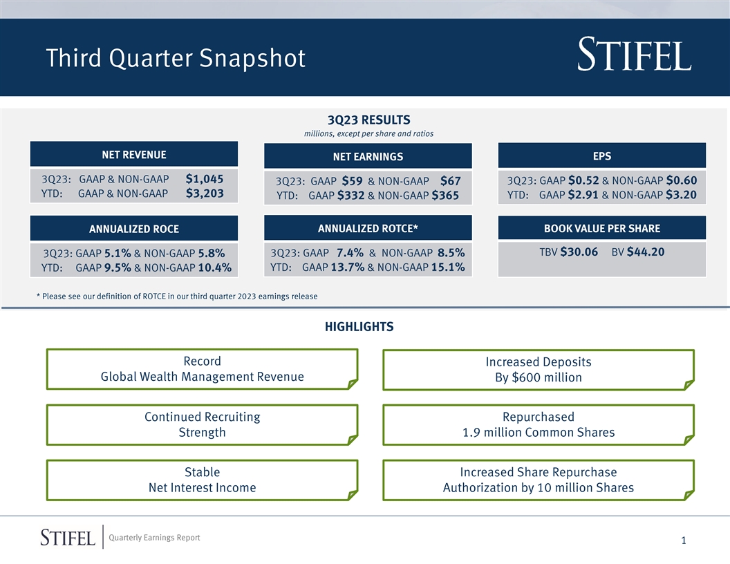 Third Quarter Snapshot 3Q23 RESULTS millions, except per share and ratios NET REVENUE NET EARNINGS EPS 3Q23: GAAP & NON-GAAP $1,045 3Q23: GAAP $0.52 & NON-GAAP $0.60 3Q23: GAAP $59 & NON-GAAP $67 YTD: GAAP & NON-GAAP $3,203 YTD: GAAP $332 & NON-GAAP $365 YTD: GAAP $2.91 & NON-GAAP $3.20 ANNUALIZED ROTCE* BOOK VALUE PER SHARE ANNUALIZED ROCE TBV $30.06 BV $44.20 3Q23: GAAP 5.1% & NON-GAAP 5.8% 3Q23: GAAP 7.4% & NON-GAAP 8.5% YTD: GAAP 13.7% & NON-GAAP 15.1% YTD: GAAP 9.5% & NON-GAAP 10.4% * Please see our definition of ROTCE in our third quarter 2023 earnings release HIGHLIGHTS Record Increased Deposits Global Wealth Management Revenue By $600 million Continued Recruiting Repurchased Strength 1.9 million Common Shares Stable Increased Share Repurchase Net Interest Income Authorization by 10 million Shares Quarterly Earnings Report 1
