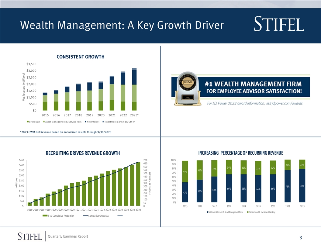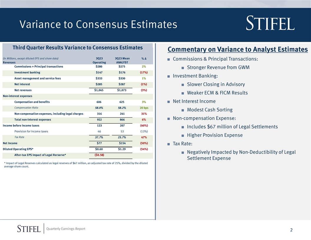 Variance to Consensus Estimates Third Quarter Results Variance to Consensus Estimates Commentary on Variance to Analyst Estimates (in Millions, except diluted EPS and share data) 3Q23 3Q23 Mean % Δ ■ Commissions & Principal Transactions: Revenues Operating ANALYST Commissions + Principal transactions $280 $275 2% ■ Stronger Revenue from GWM Investment banking $147 $176 (17%) ■ Investment Banking: Asset management and service fees $333 $330 1% Net interest $285 $287 (1%) ■ Slower Closing in Advisory Net revenues $1,045 $1,073 (3%) ■ Weaker ECM & FICM Results Non-interest expenses Compensation and benefits 606 625 3%■ Net Interest Income Compensation Ratio 58.0% 58.2% 20 bps ■ Modest Cash Sorting Non-compensation expenses, including legal charges 316 241 31% ■ Non-compensation Expense: Total non-interest expenses 922 866 6% Income before income taxes 123 207 (40%) ■ Includes $67 million of Legal Settlements Provision for income taxes 46 53 (13%) ■ Higher Provision Expense Tax Rate 37.7% 25.7% 47% Net Income $77 $154 (50%) ■ Tax Rate: Diluted Operating EPS* $0.60 $1.29 (54%) ■ Negatively Impacted by Non-Deductibility of Legal After-tax EPS Impact of Legal Rerserve* ($0.58) Settlement Expense * Impact of Legal Reserves calculated as legal reserves of $67 million, an adjusted tax rate of 25%, divided by the diluted average share count. Quarterly Earnings Report 2